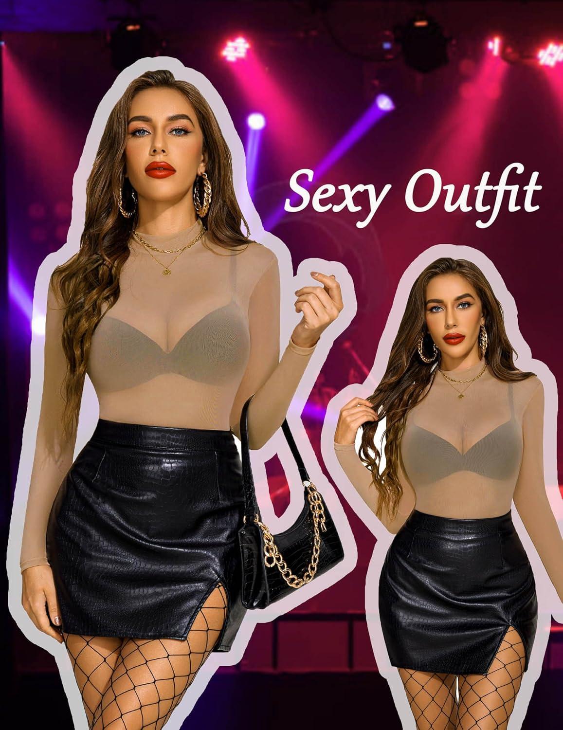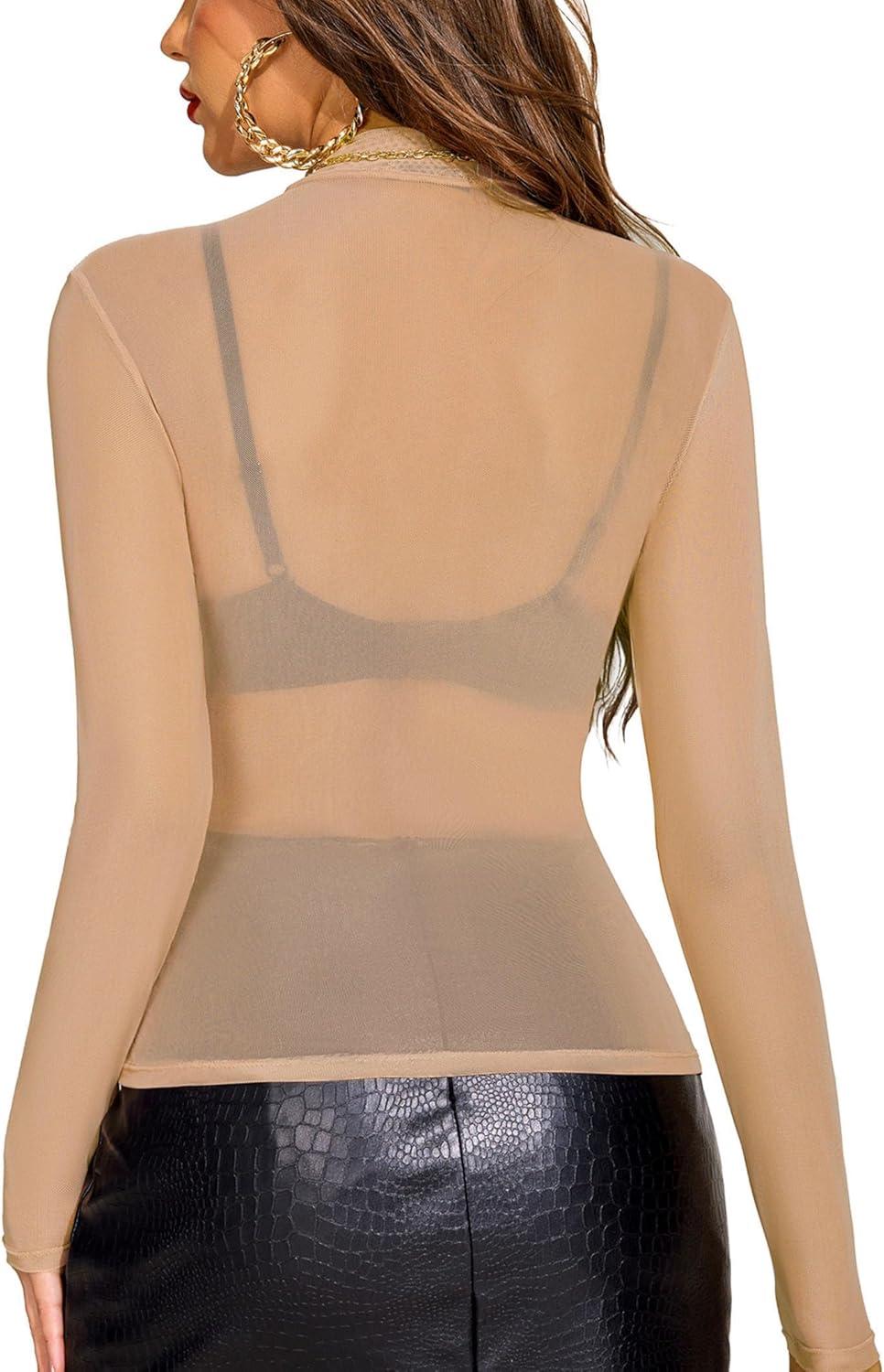 Avidlove Mesh Top for Women Long Sleeve See Through Shirt Mock Neck Sheer Blouse XS-XXL(Light Tan)