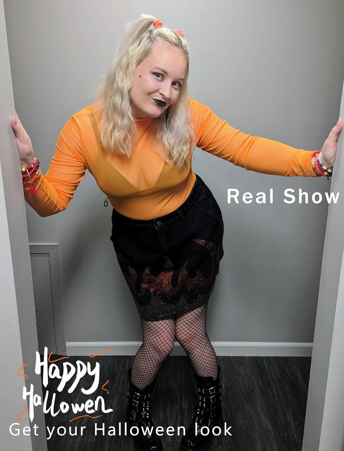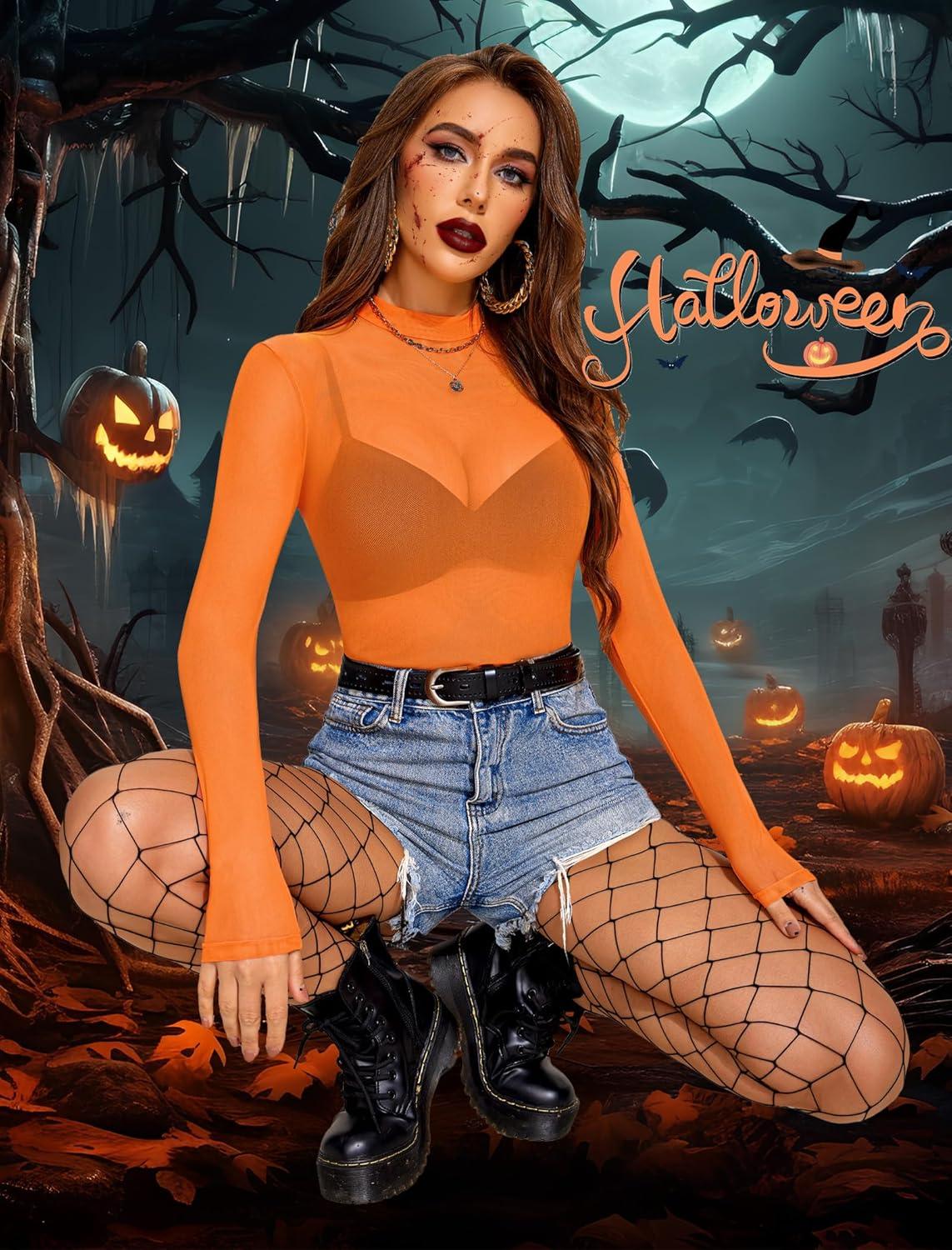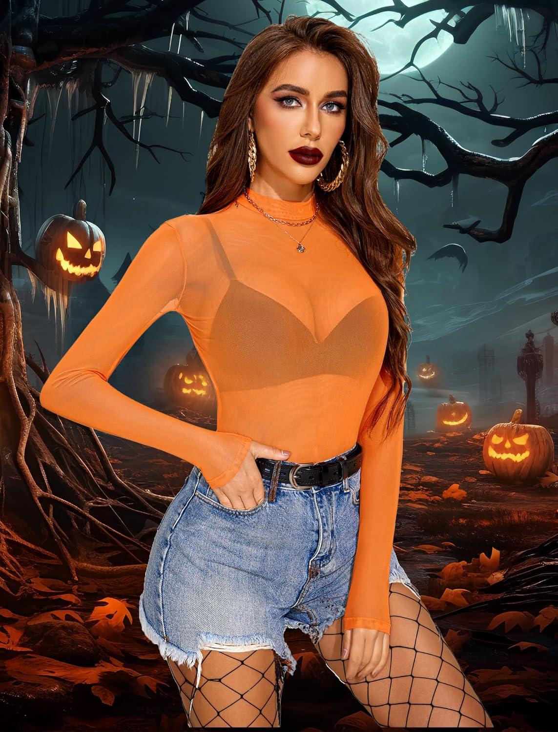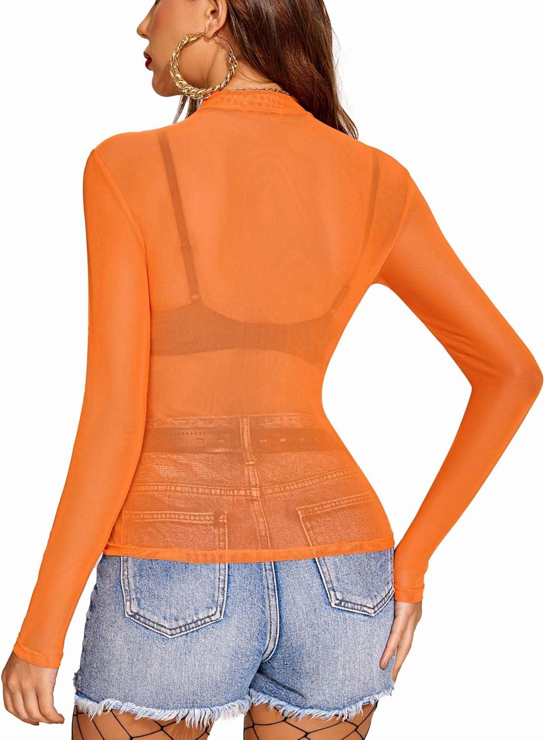 Avidlove Mesh Top for Women Long Sleeve See Through Shirt Mock Neck Sheer Blouse XS-XXL(Orange)