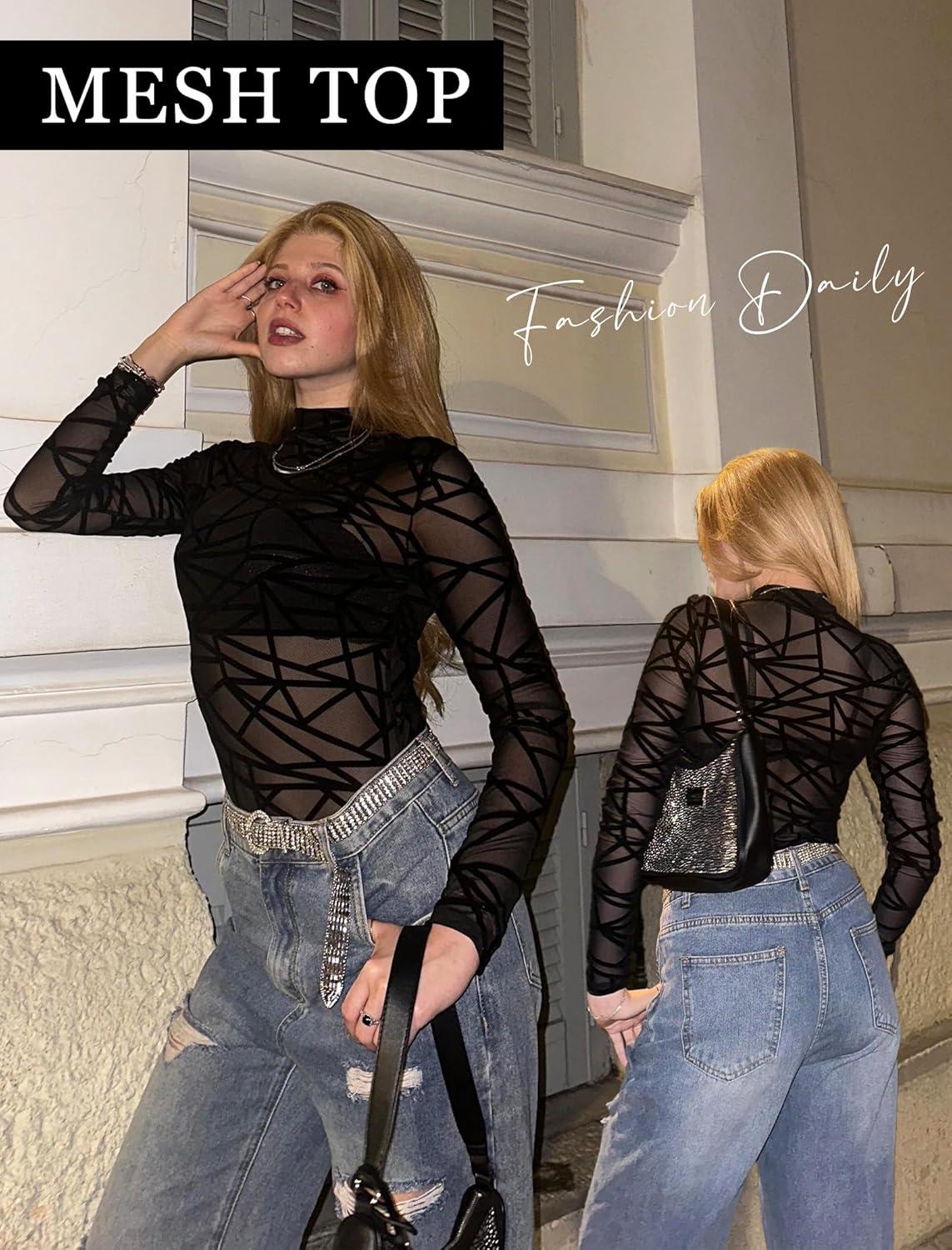 Avidlove Mesh Top for Women Long Sleeve See Through Shirt Mock Neck Sheer Blouse XS-XXL(Pat2)
