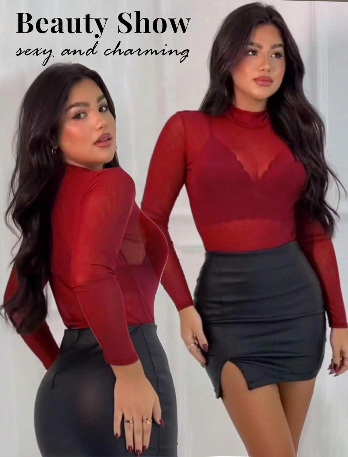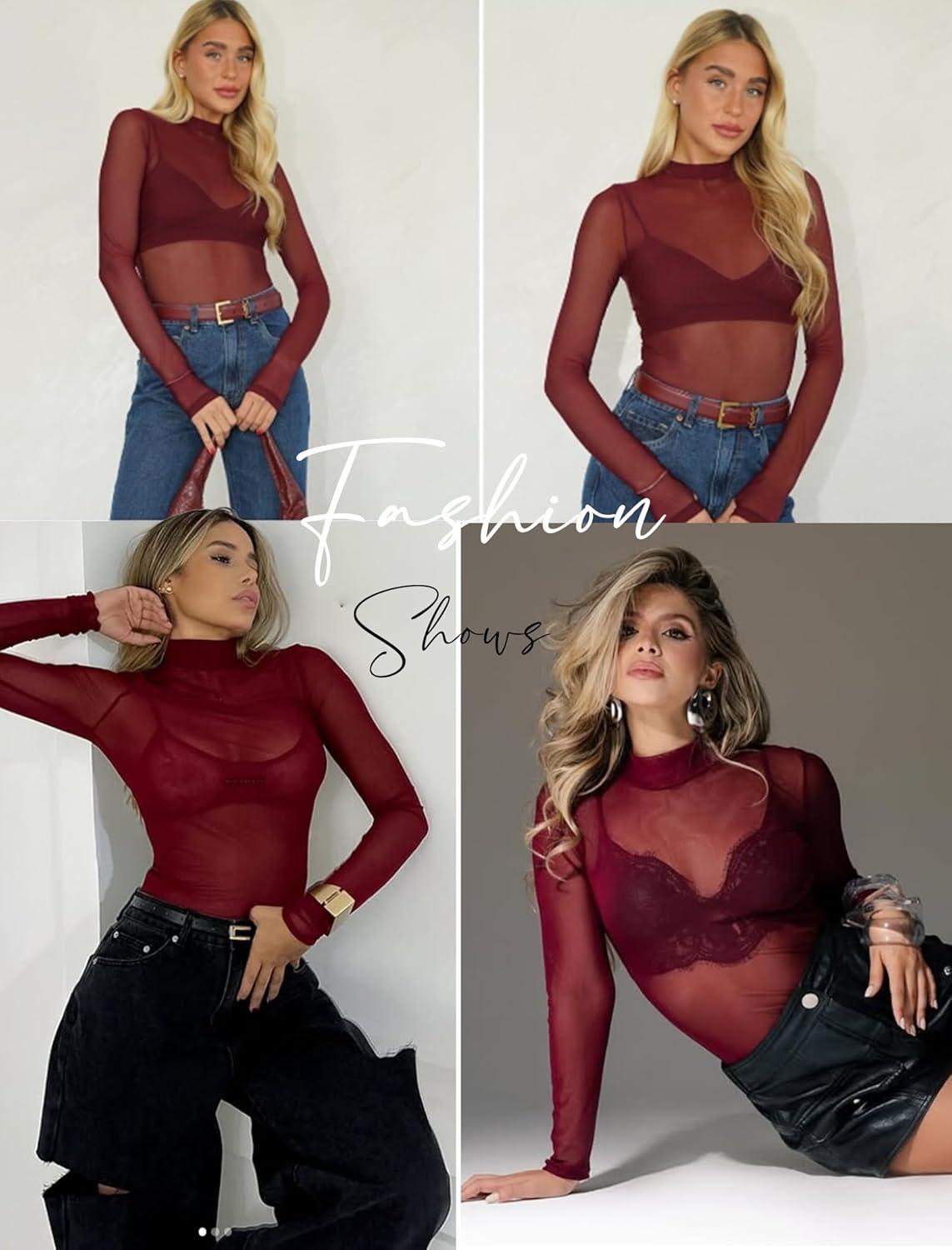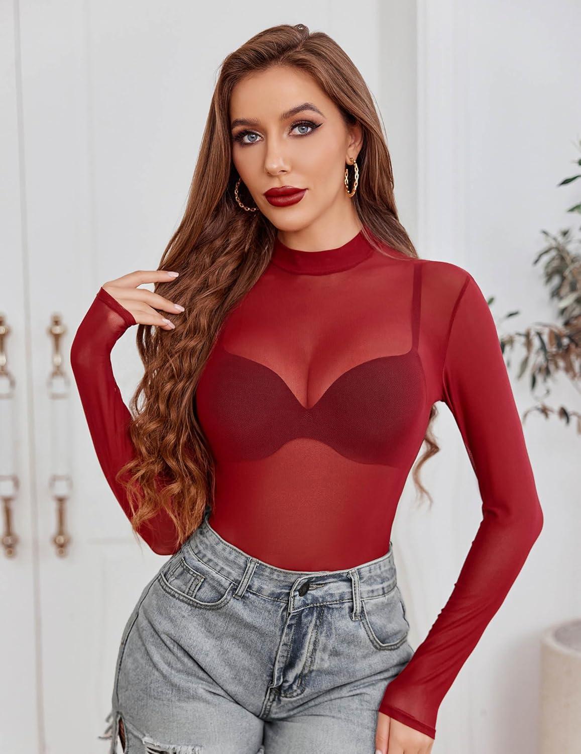 Avidlove Mesh Top for Women Long Sleeve See Through Shirt Mock Neck Sheer Blouse XS-XXL(Wine Red)