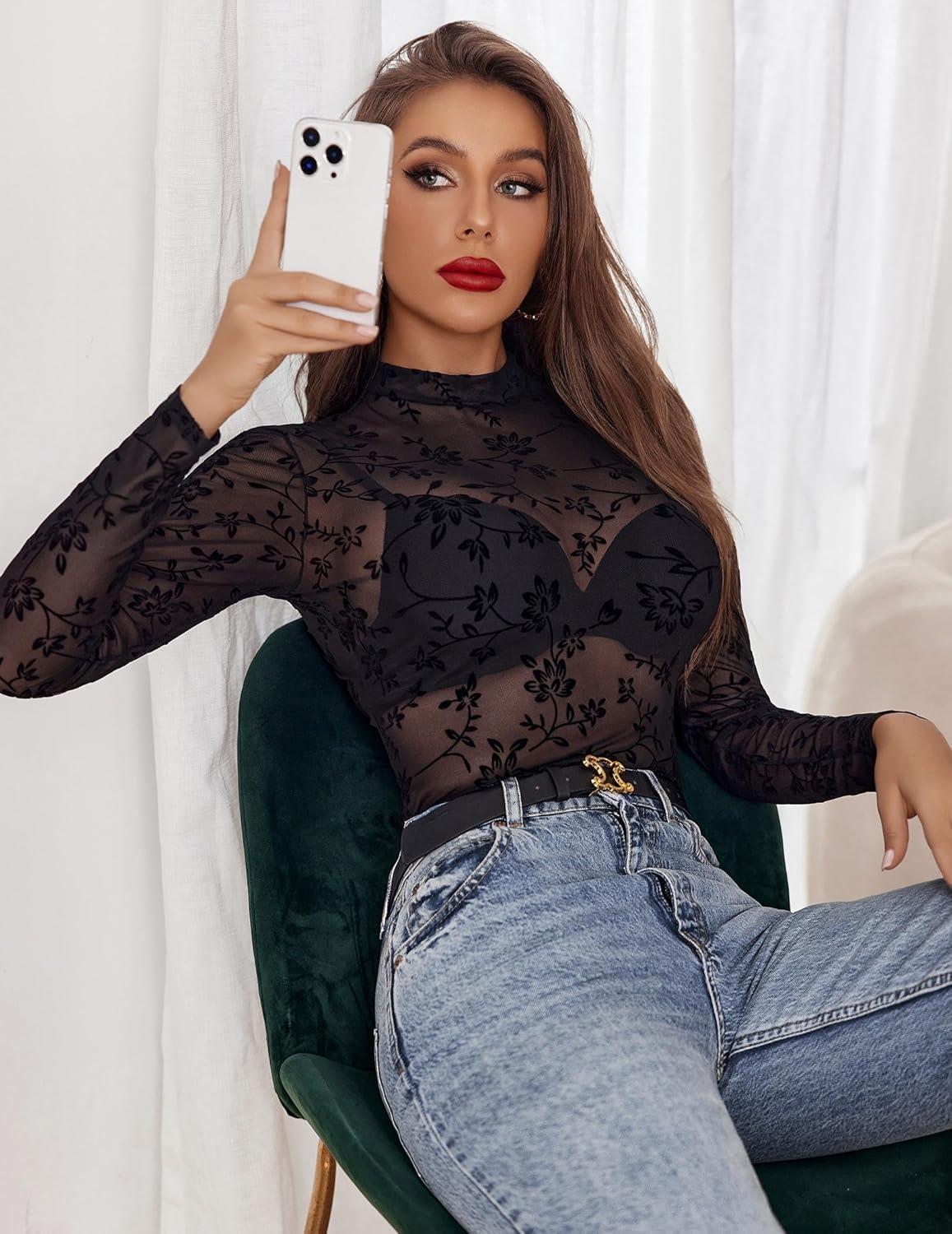 Avidlove Mesh Top for Women Long Sleeve See Through Shirt Mock Neck Sheer Blouse XS-XXL(1-black)