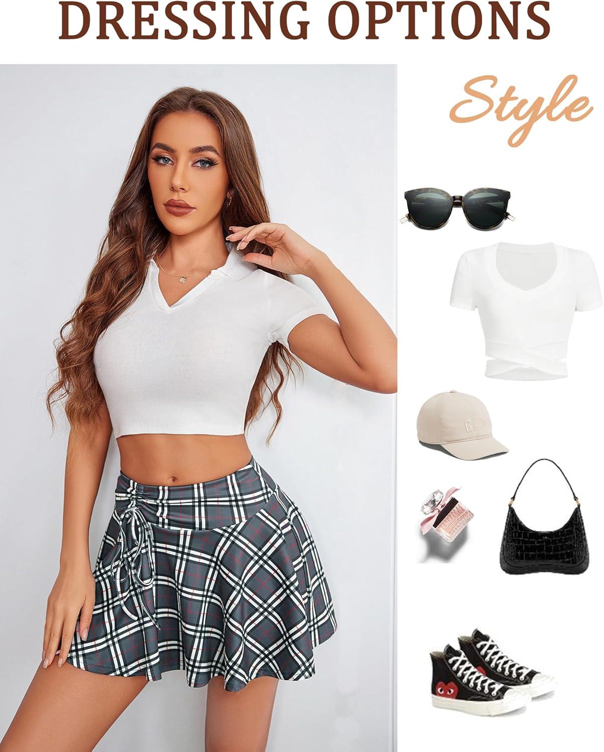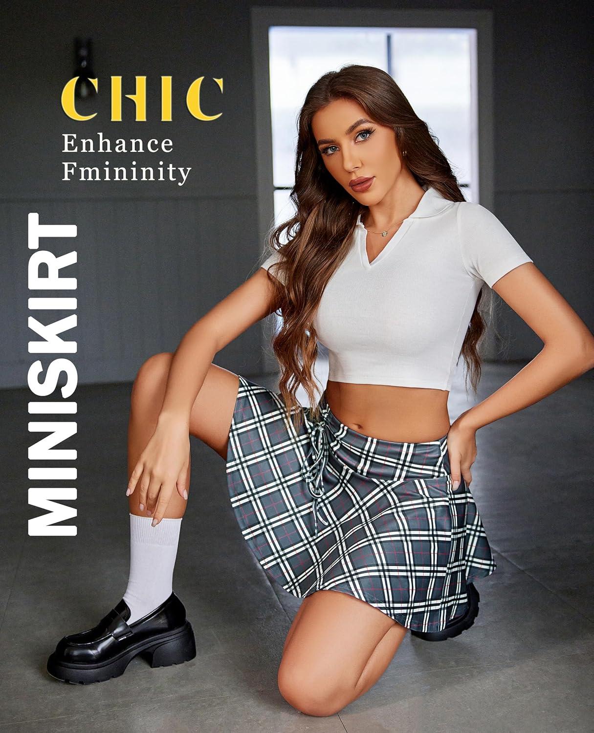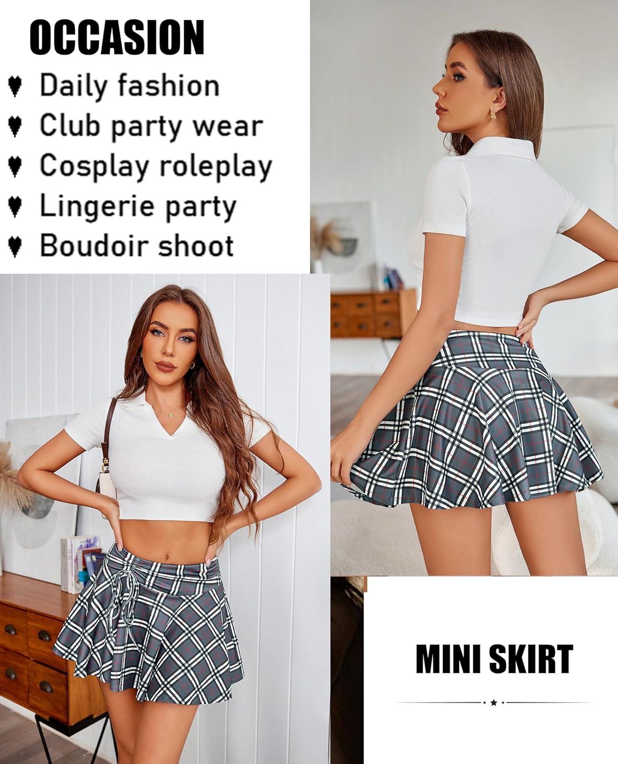 Avidlove Mini Skirt for Women Pleated Drawstring High Waist Skater Skirt Sexy Lingerie Skirts S-XXL(Gray Plaid)