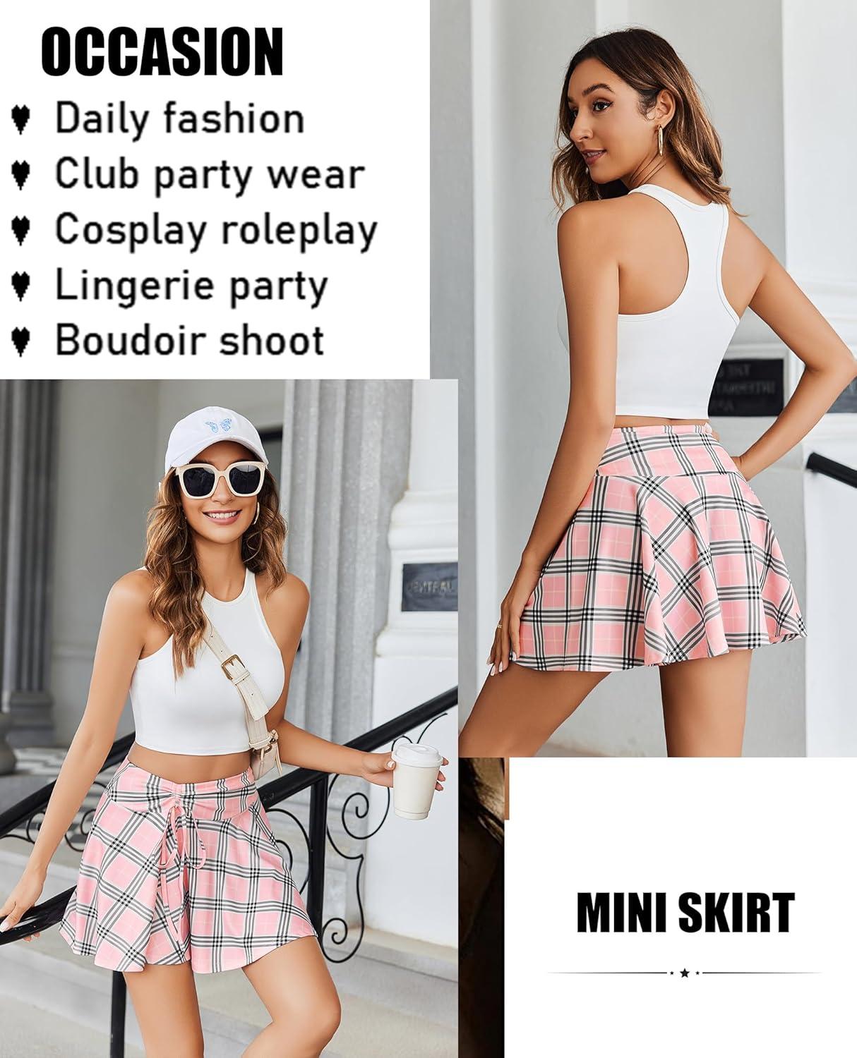 Avidlove Mini Skirt for Women Pleated Drawstring High Waist Skater Skirt Sexy Lingerie Skirts S-XXL(Pink Plaid)