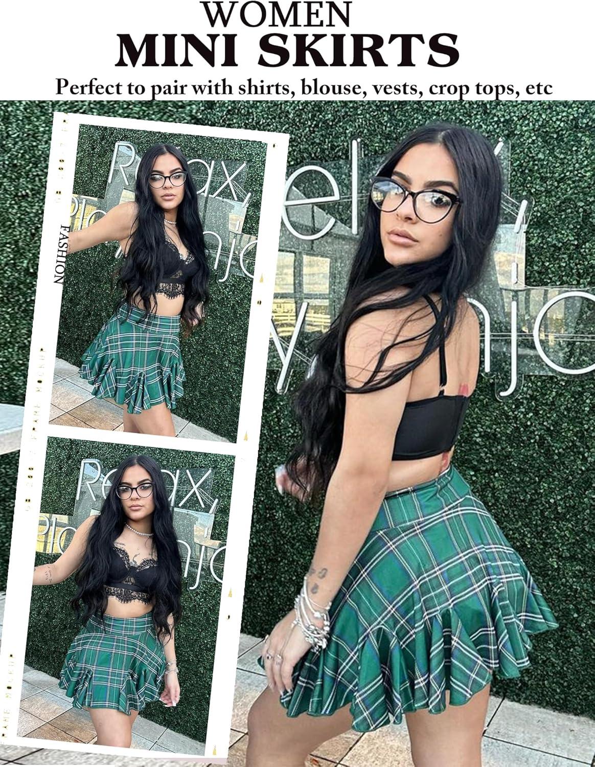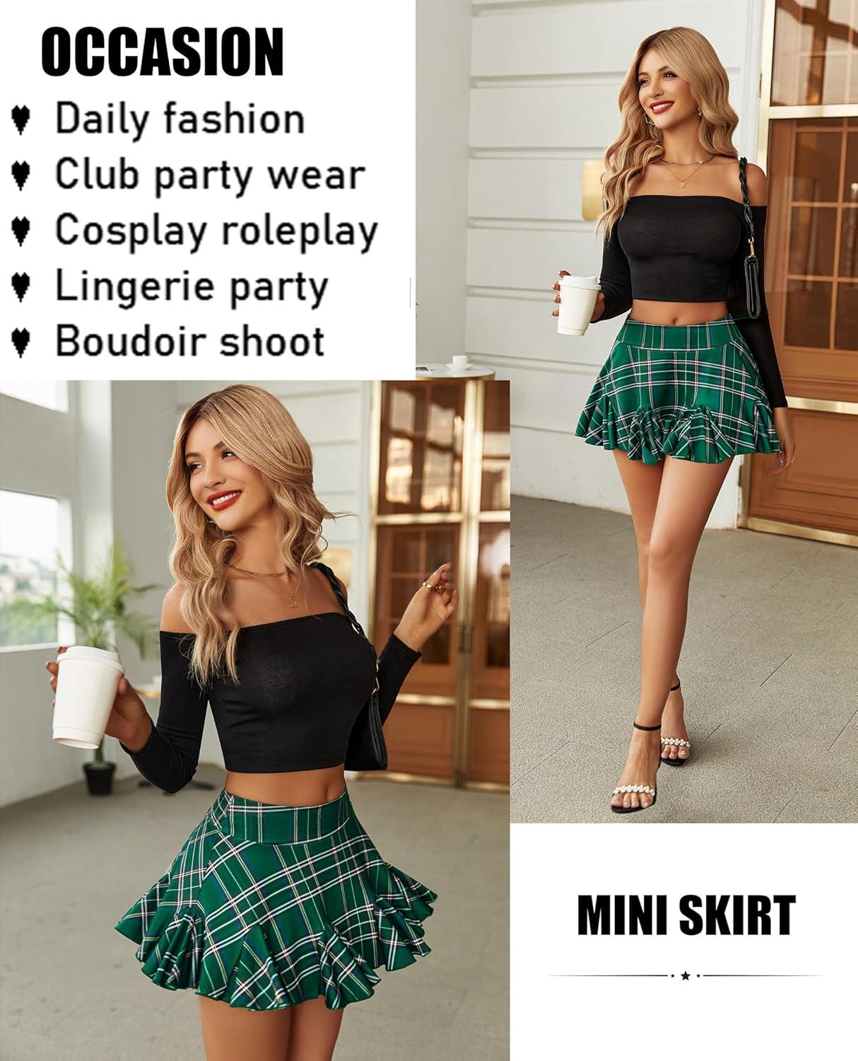 Avidlove Mini Skirt for Women Sexy Pleated Skirts High Waist Skater Skirt Ruffle Lingerie Skirts(Green Plaid)