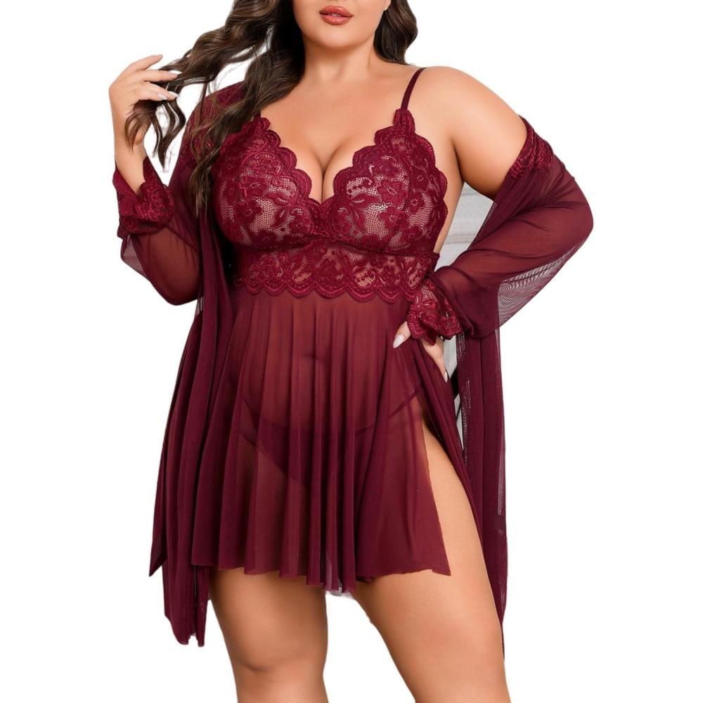 Avidlove Plus Size Lingerie Sexy Lingerie Set Women’s Exotic Nightgowns Lace Chemise Lingerie Side Slit Nightdress(Dark Red)