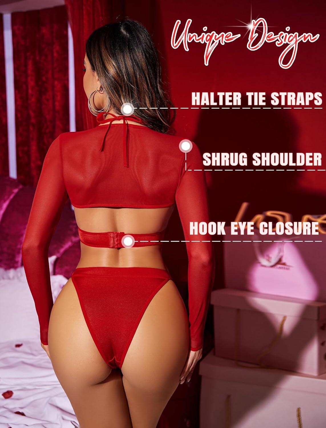 Avidlove Rave Outfits for Women Festival Sexy Lingerie Bodysuit Buckle Shrug Crop Top Set(B-red)