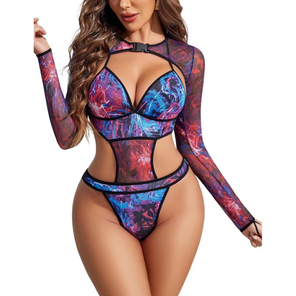 imageAvidlove Rave Outfits for Women Festival Sexy Lingerie Bodysuit Buckle Shrug Crop Top SetPurple Tie Dye