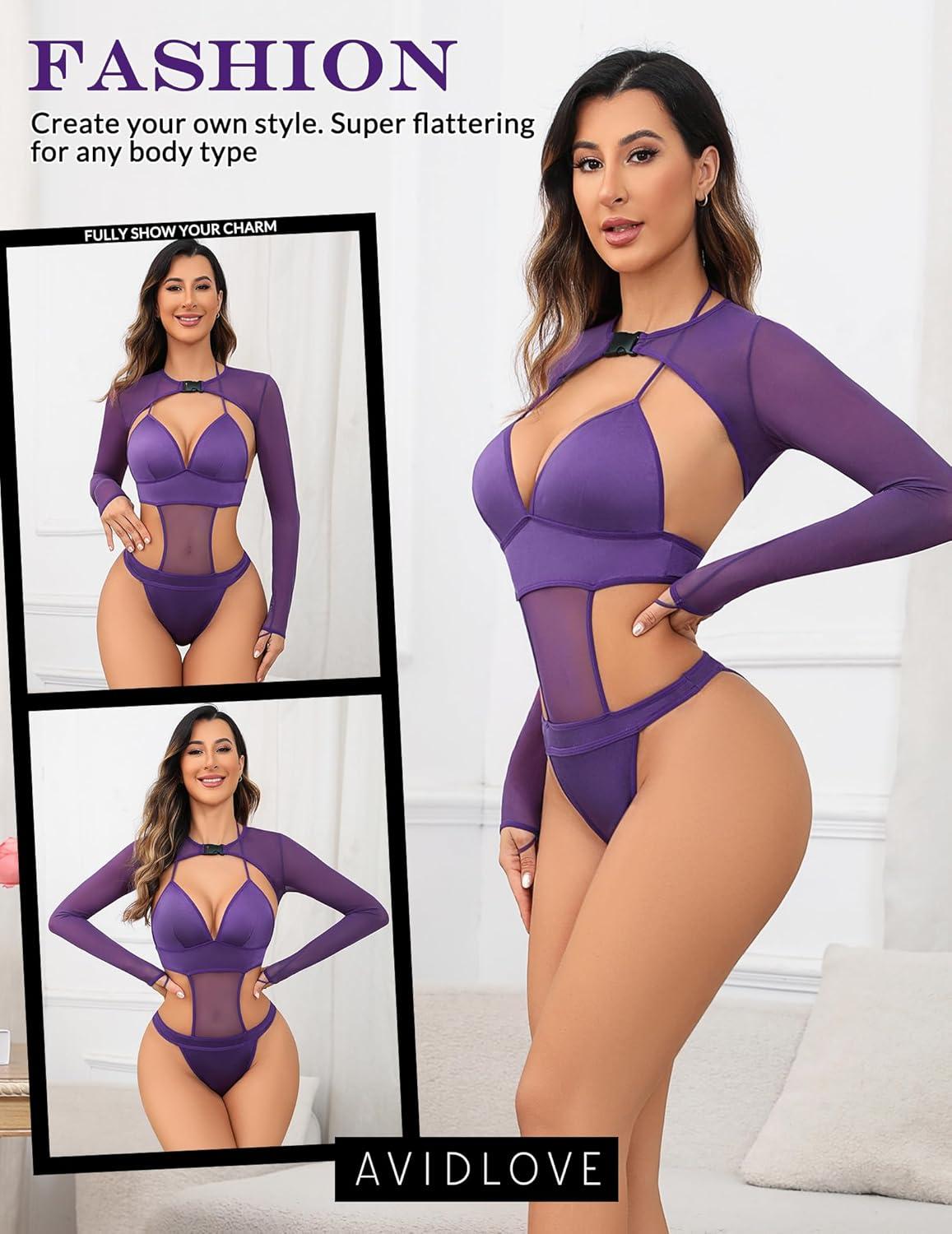 imageAvidlove Rave Outfits for Women Festival Sexy Lingerie Bodysuit Buckle Shrug Crop Top SetPurple