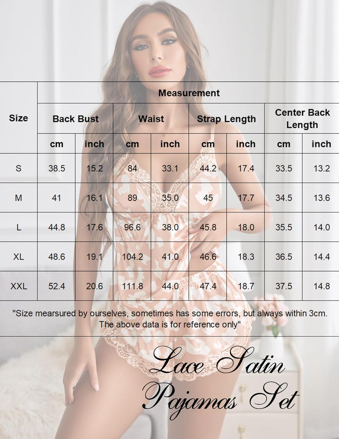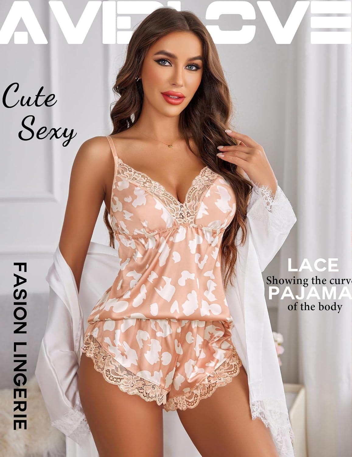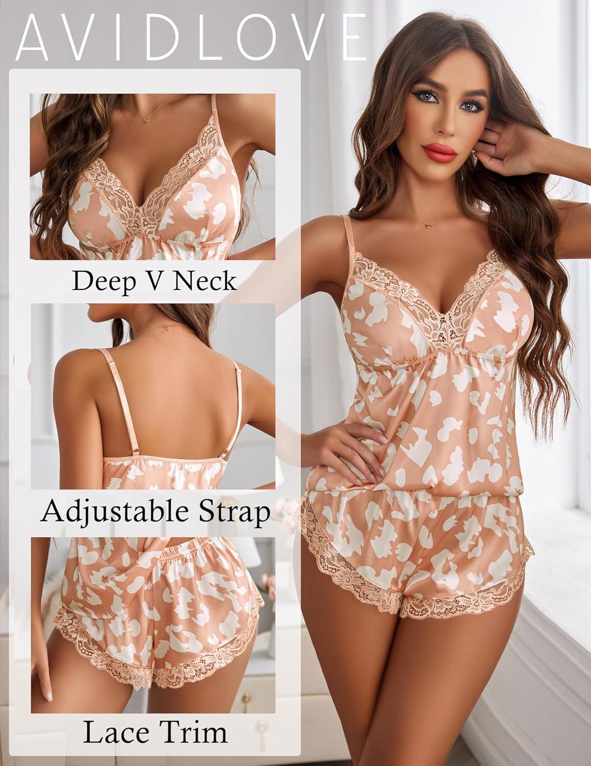 Avidlove Satin Pajamas Set Womens Lace Sleepwear Sexy Lingerie Cami Shorts Set S-XXL(Pink Leopard)