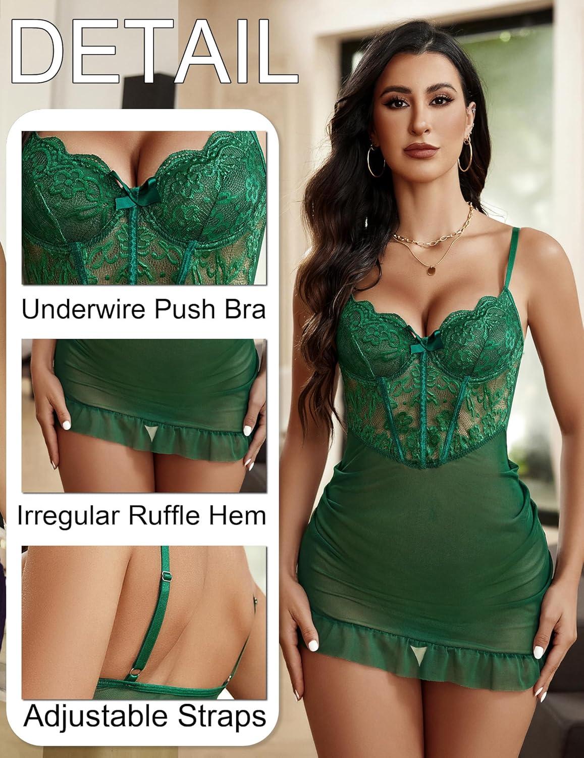 Avidlove Sexy Lingerie for Women Lace Babydoll Dress with Underwire Support Ruffle Hem Hip Chemise Nightgown(Green)