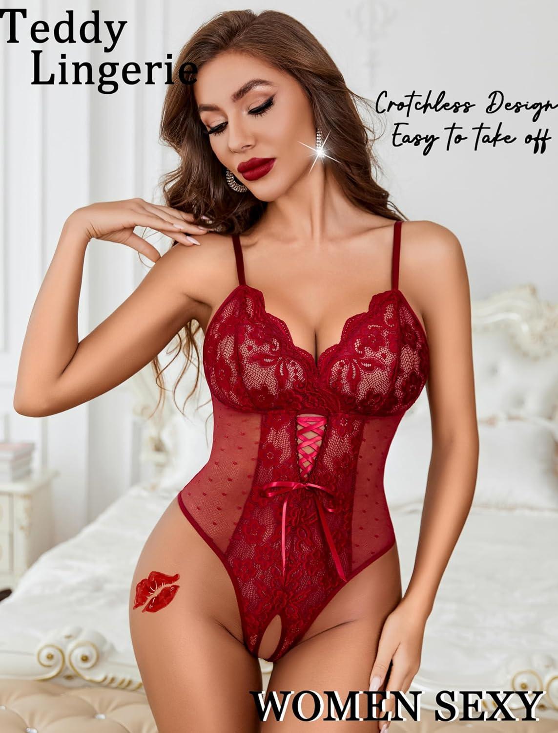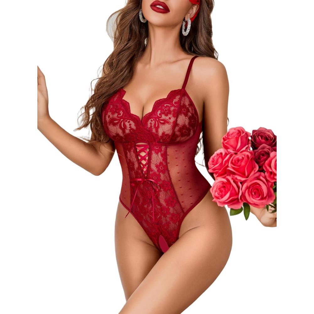 Avidlove Sexy Lingerie for Women One Piece Lingerie Deep V Teddy Babydoll Sexy Lace Bodysuit(Wine Red)