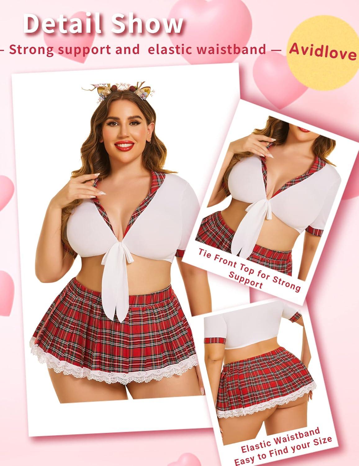 Avidlove Sexy Plus Size Lingerie Set for Women Sexy School Girl Halloween Costumes Cosplay Lingerie with Mini Skirt(Red Plaid)