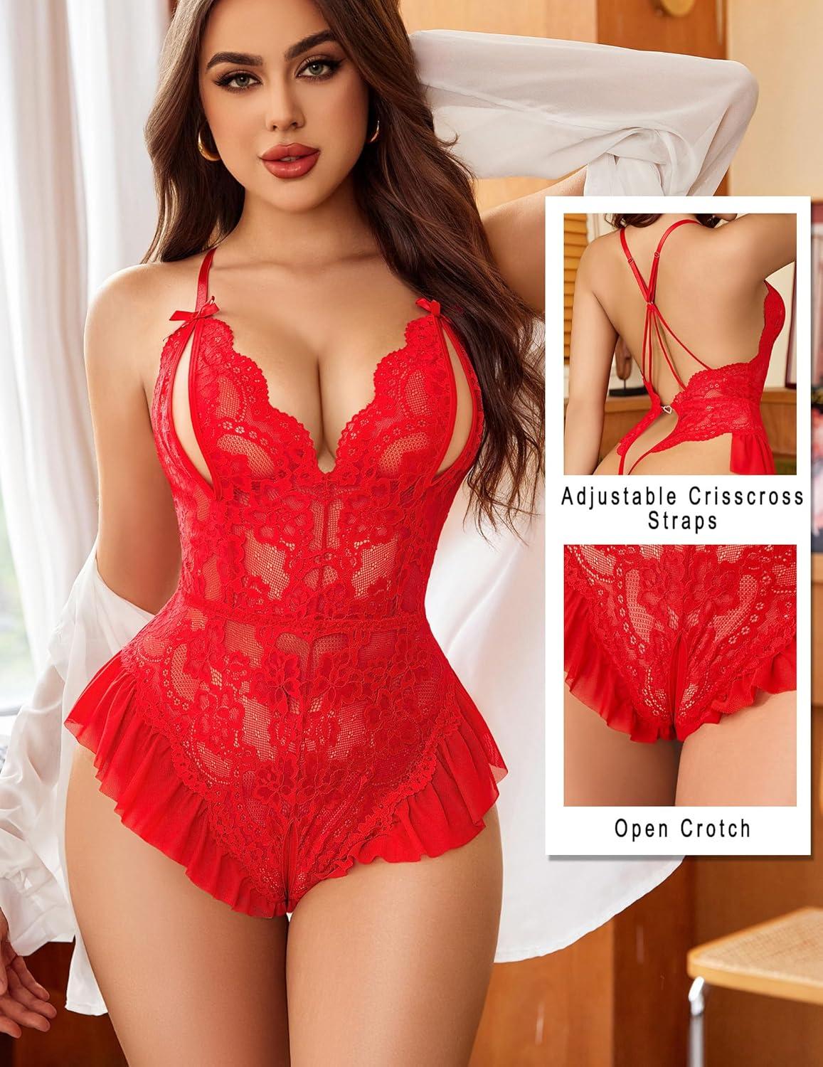 Avidlove Teddy Lingerie for Women Sexy Cut Out Lace Bodysuit One Piece Criss Cross Backless Mini Babydoll(Red)