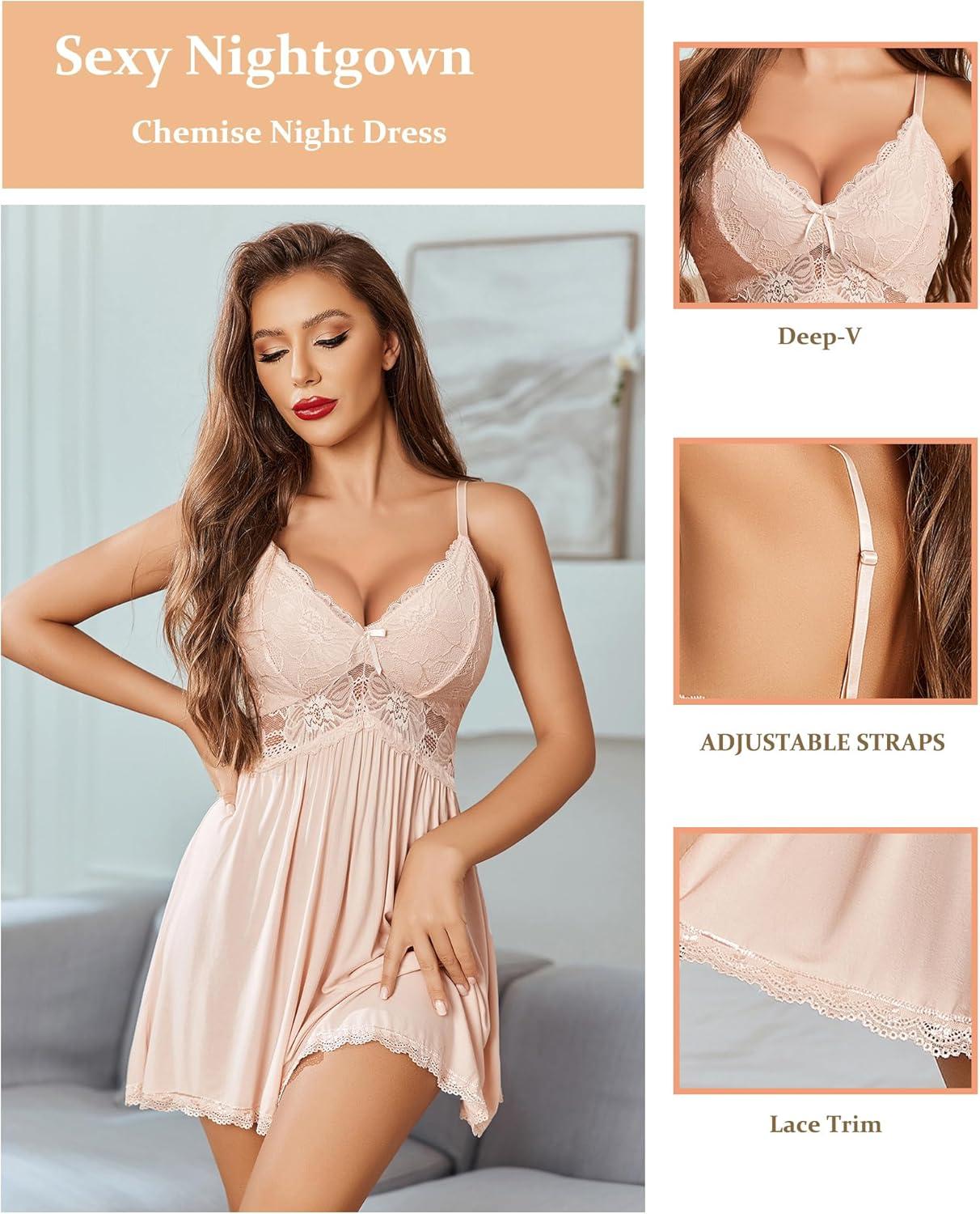 Avidlove Women Chemise Night Gown Lace Modal Sleepwear V-Neck Full Slip Babydoll Lingerie Sexy Nightgowns(Champagne)