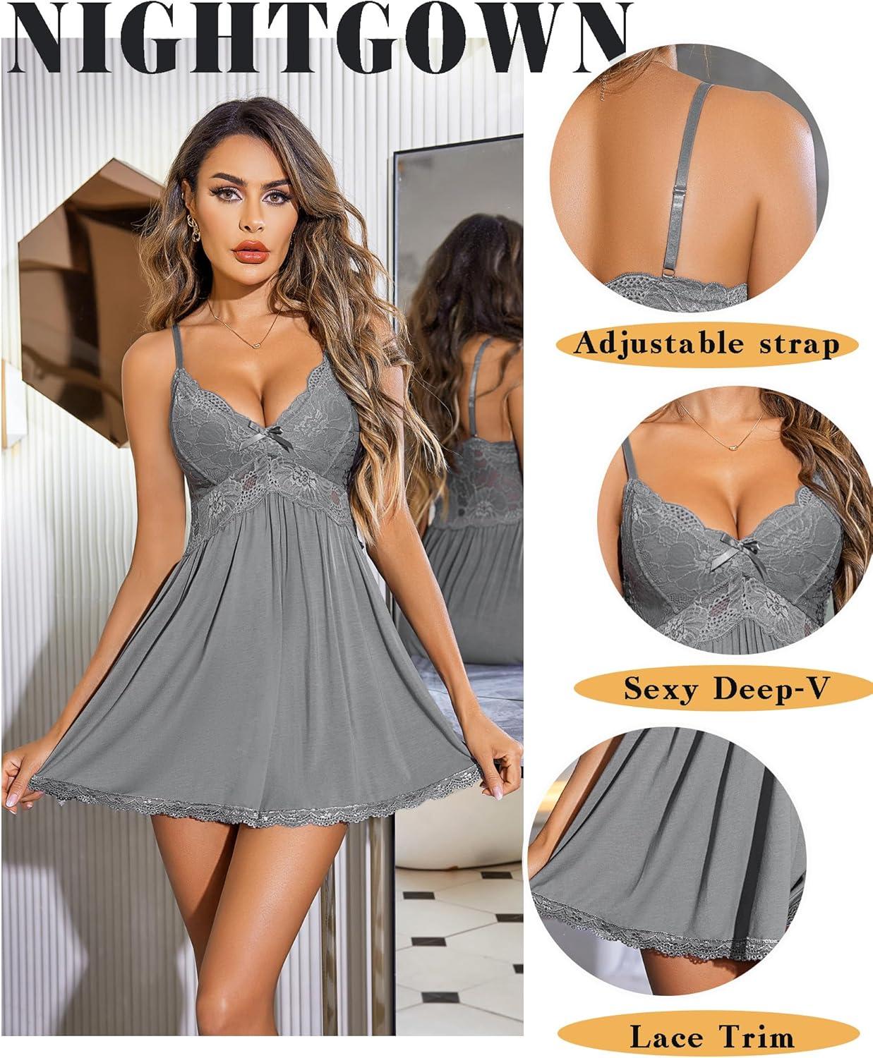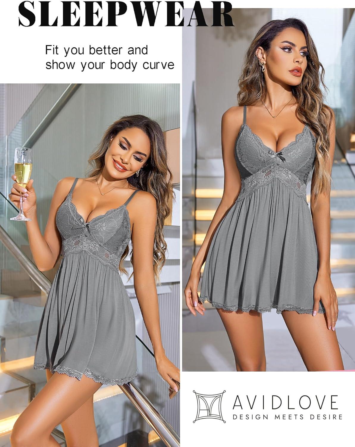Avidlove Women Chemise Night Gown Lace Modal Sleepwear V-Neck Full Slip Babydoll Lingerie Sexy Nightgowns(Grey)