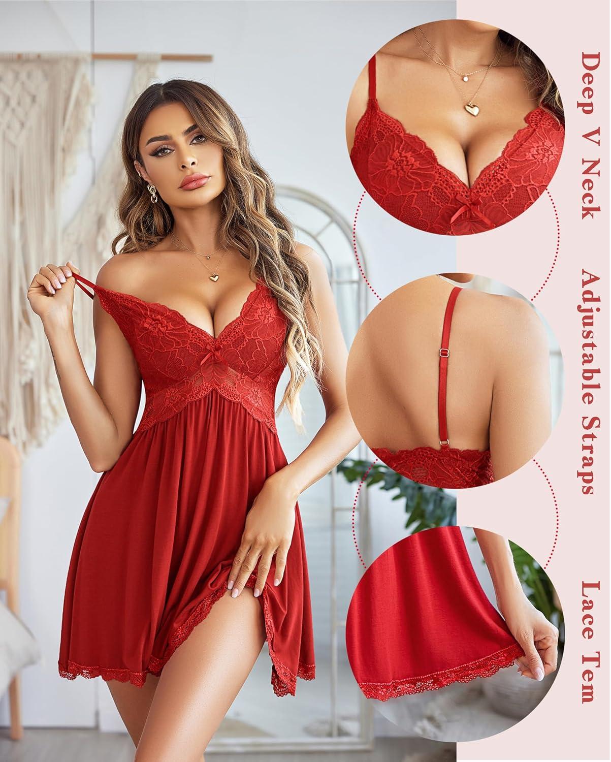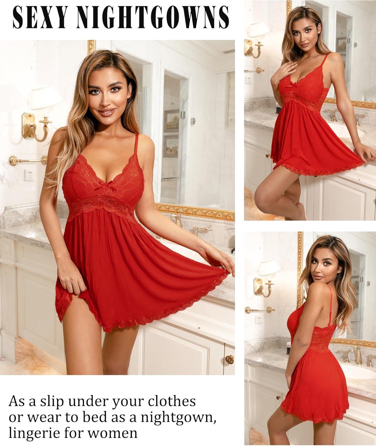 Avidlove Women Chemise Night Gown Lace Modal Sleepwear V-Neck Full Slip Babydoll Lingerie Sexy Nightgowns(Red)