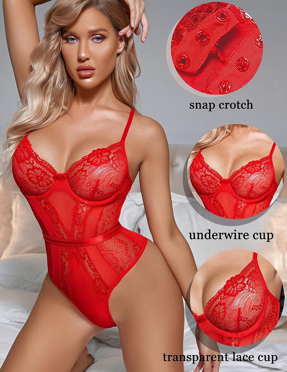 imageAvidlove Women Lingerie Bodysuit Lace Teddy Snap Crotch One Piece Underwire BabydollRed