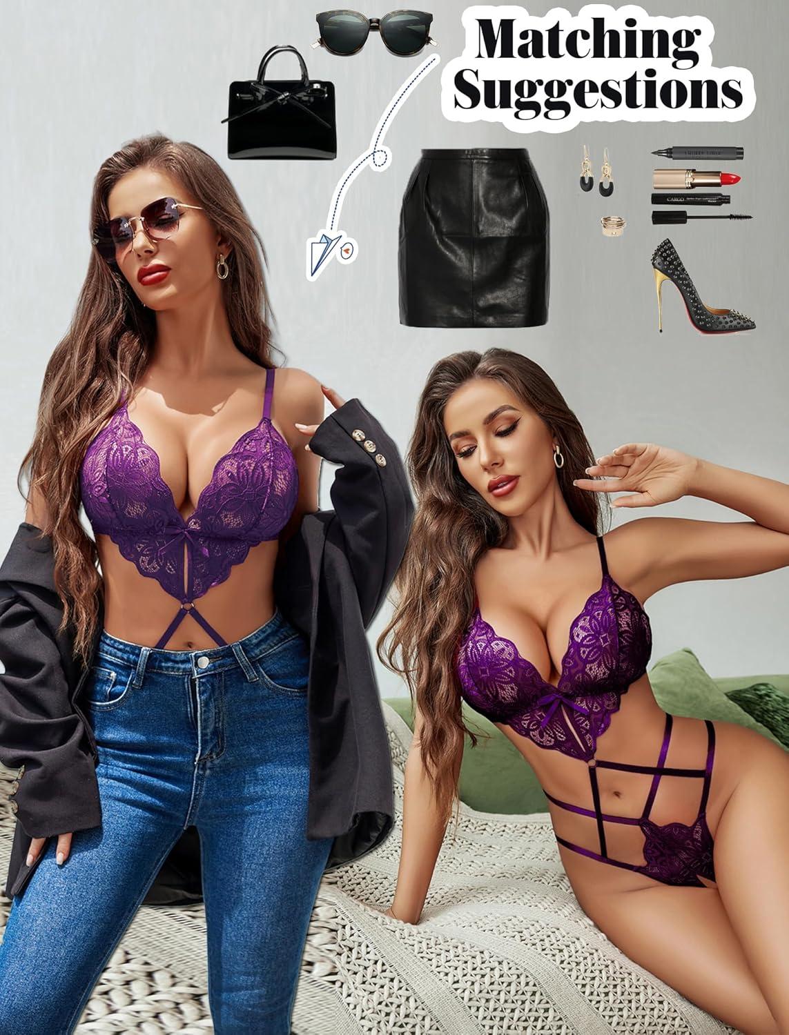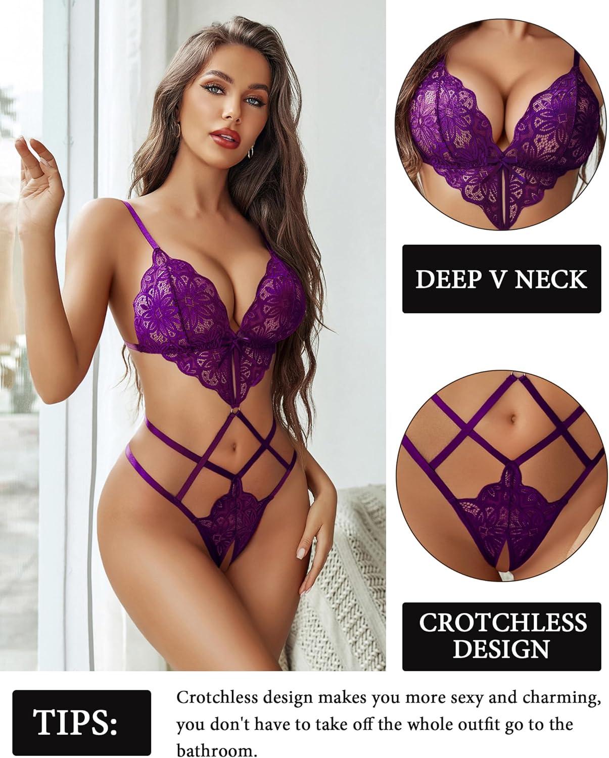 imageAvidlove Women Lingeries Deep V Teddy Lingerie Sexy Lace Bodysuit Cut Out One Piece Mini BabydollPurple