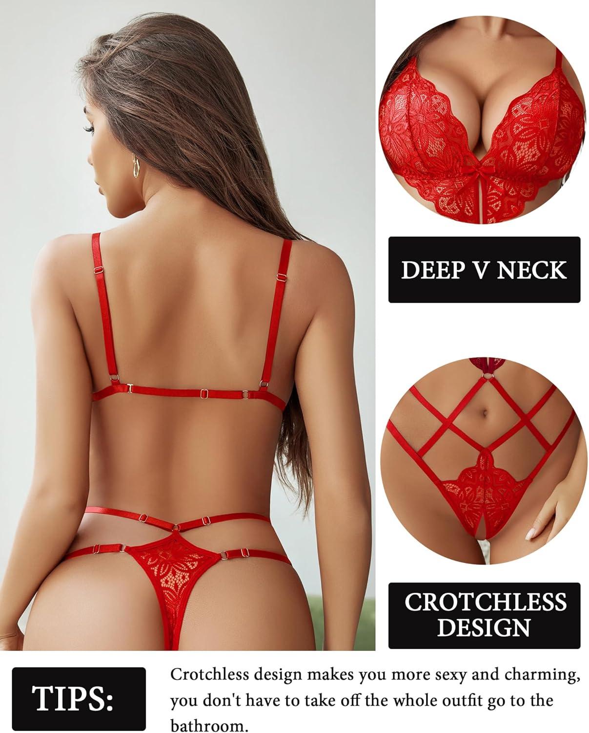 imageAvidlove Women Lingeries Deep V Teddy Lingerie Sexy Lace Bodysuit Cut Out One Piece Mini BabydollRed