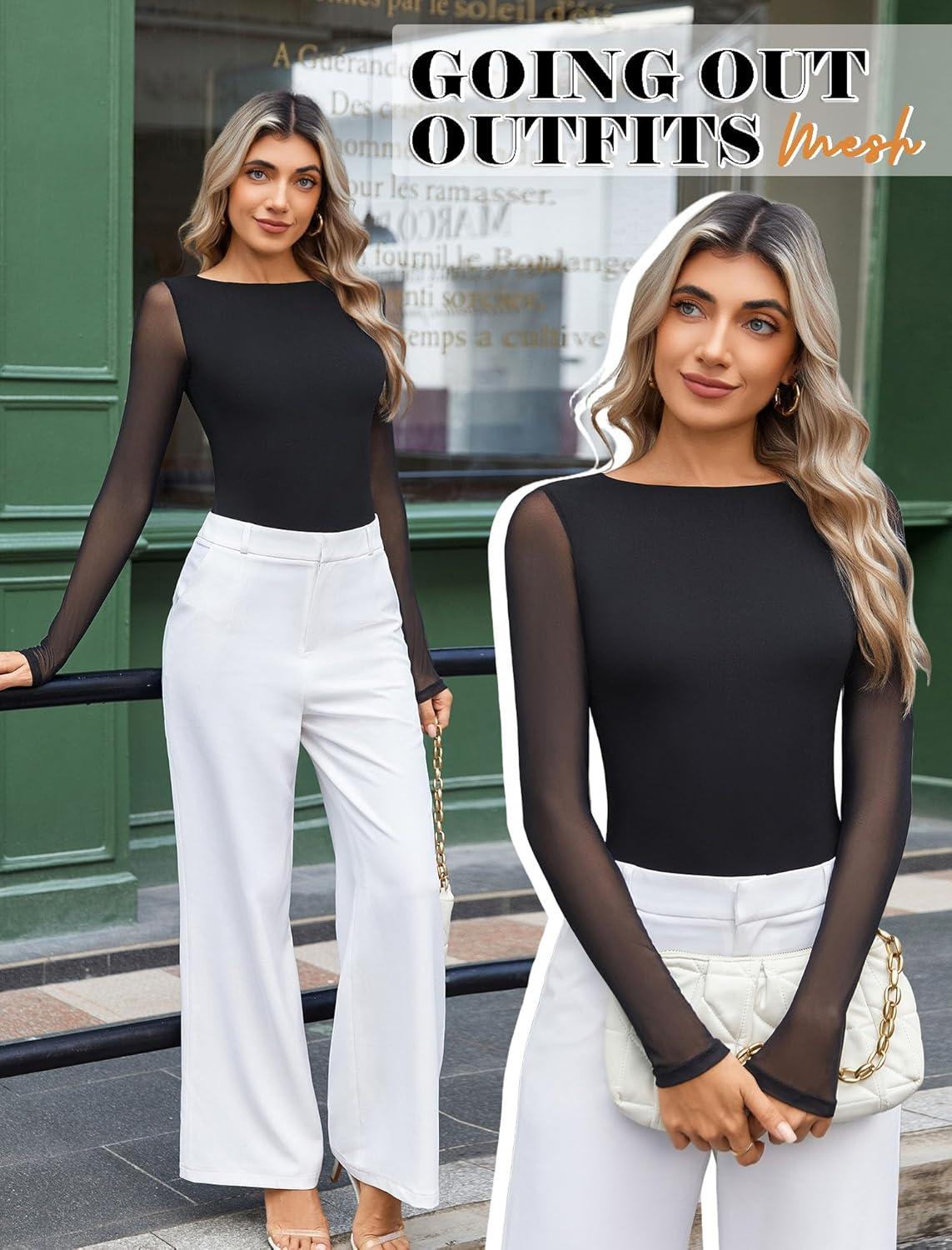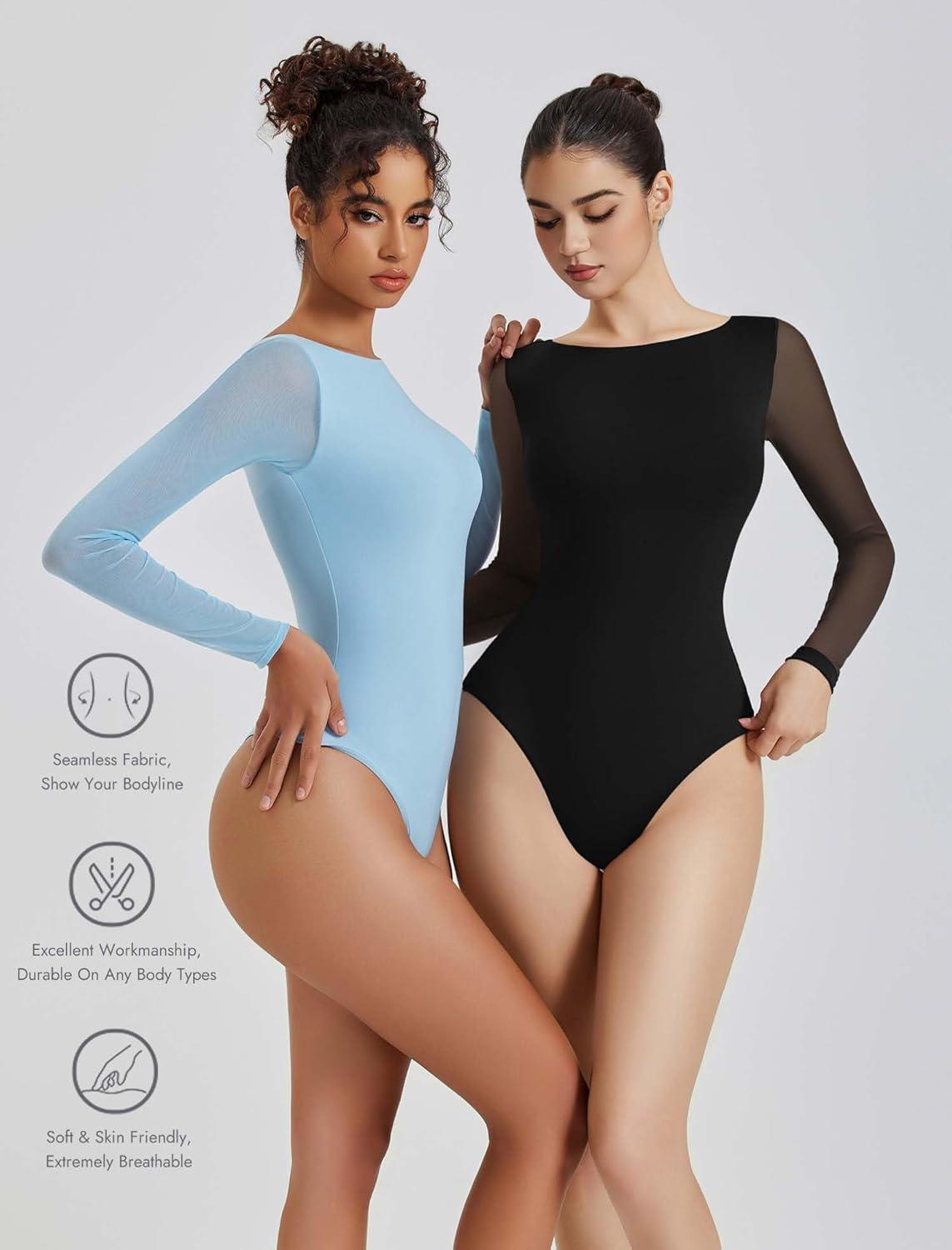 Avidlove Women Long Sleeve Body Suits Mesh Boat Neck Shapewear Bodysuit Crew Neck Leotards Going Out Tops Fall Outfits(Black)