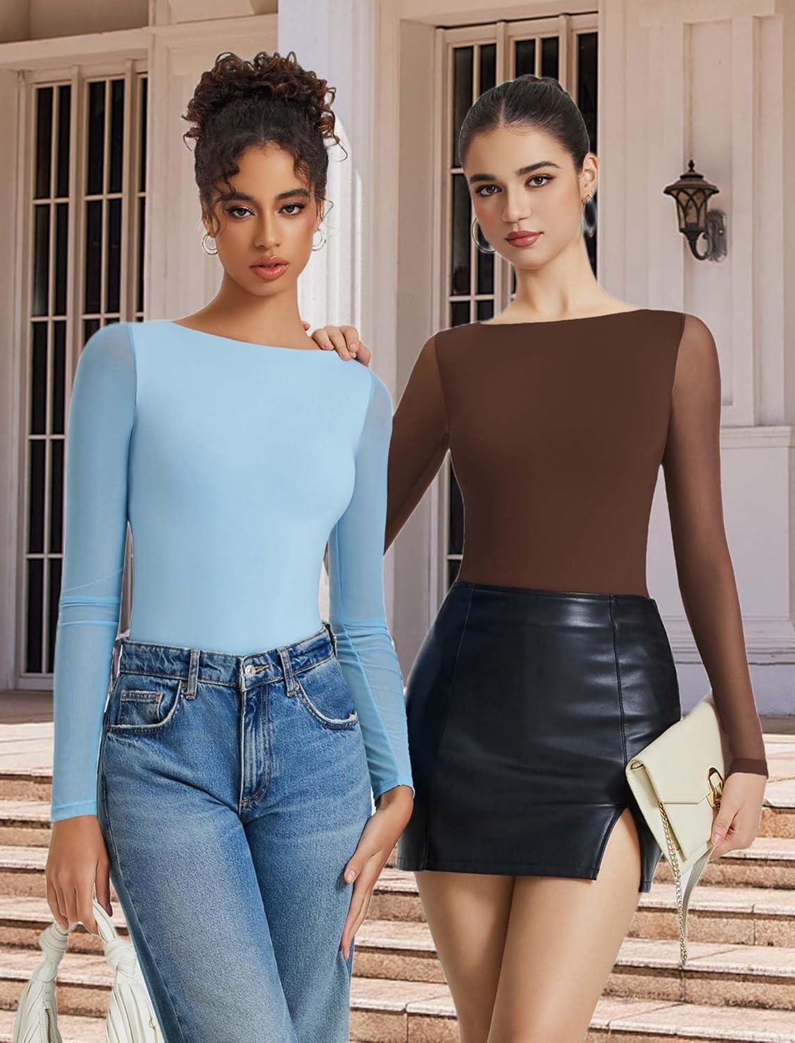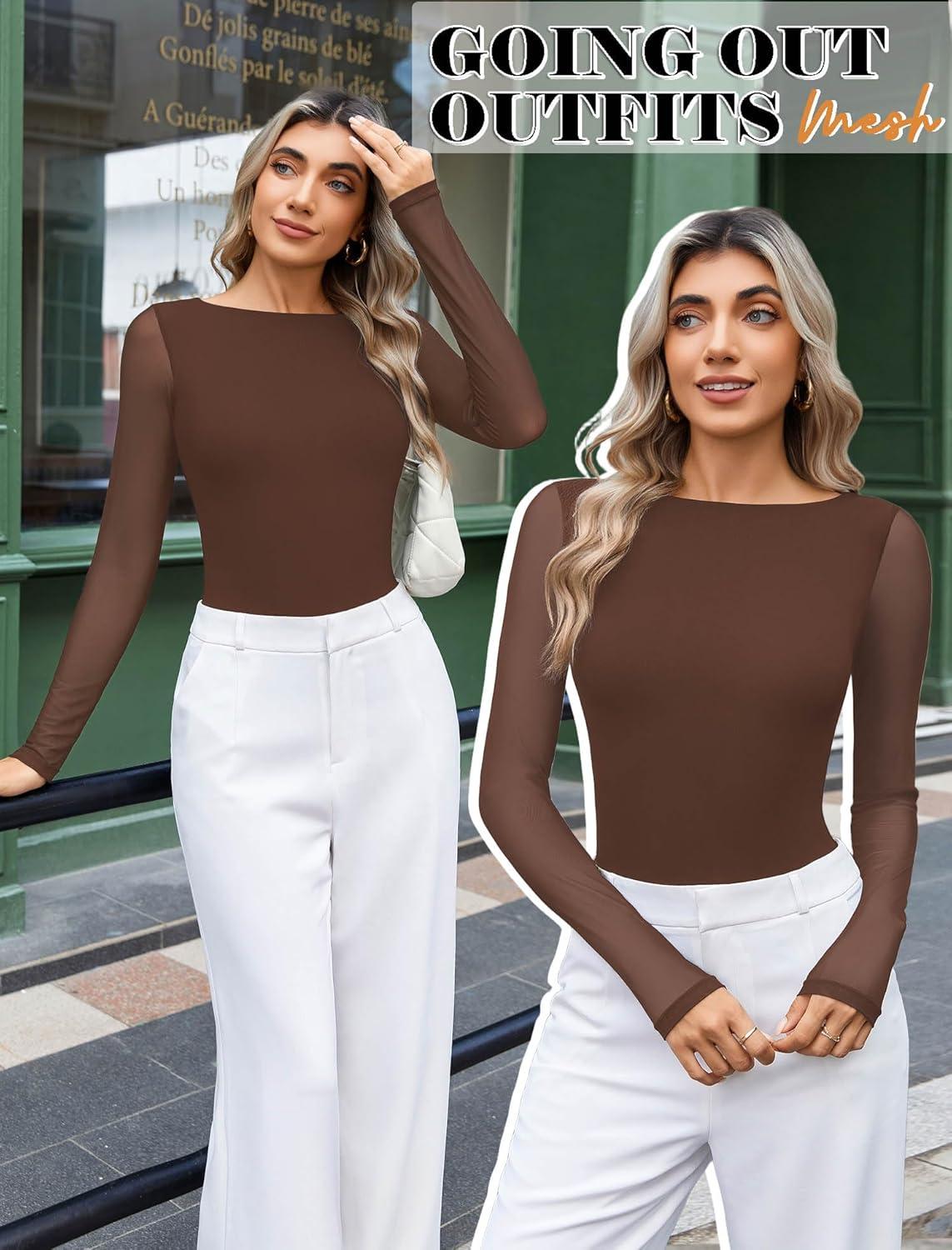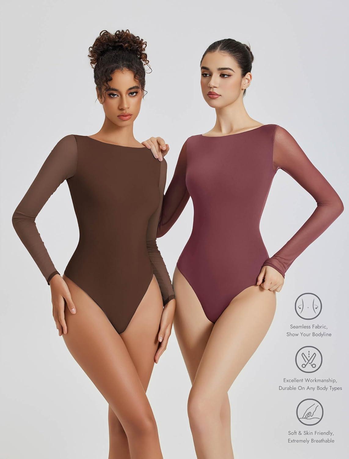 Avidlove Women Long Sleeve Body Suits Mesh Boat Neck Shapewear Bodysuit Crew Neck Leotards Going Out Tops Fall Outfits(Brown)