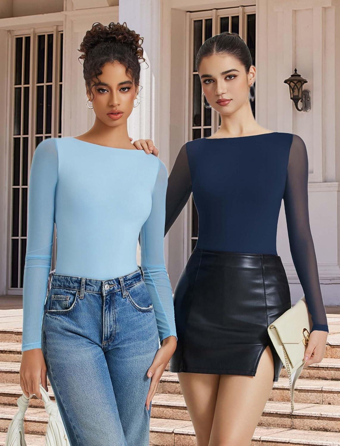 Avidlove Women Long Sleeve Body Suits Mesh Boat Neck Shapewear Bodysuit Crew Neck Leotards Going Out Tops Fall Outfits(Light Blue)