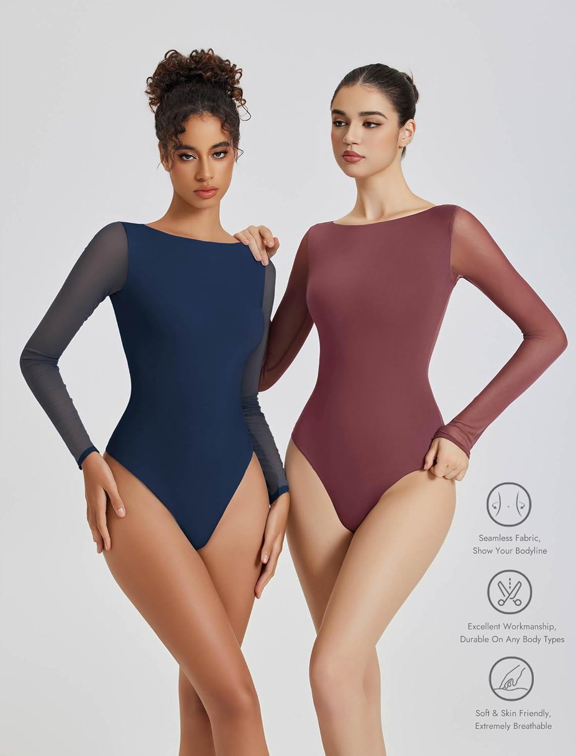 Avidlove Women Long Sleeve Body Suits Mesh Boat Neck Shapewear Bodysuit Crew Neck Leotards Going Out Tops Fall Outfits(Navy Blue)