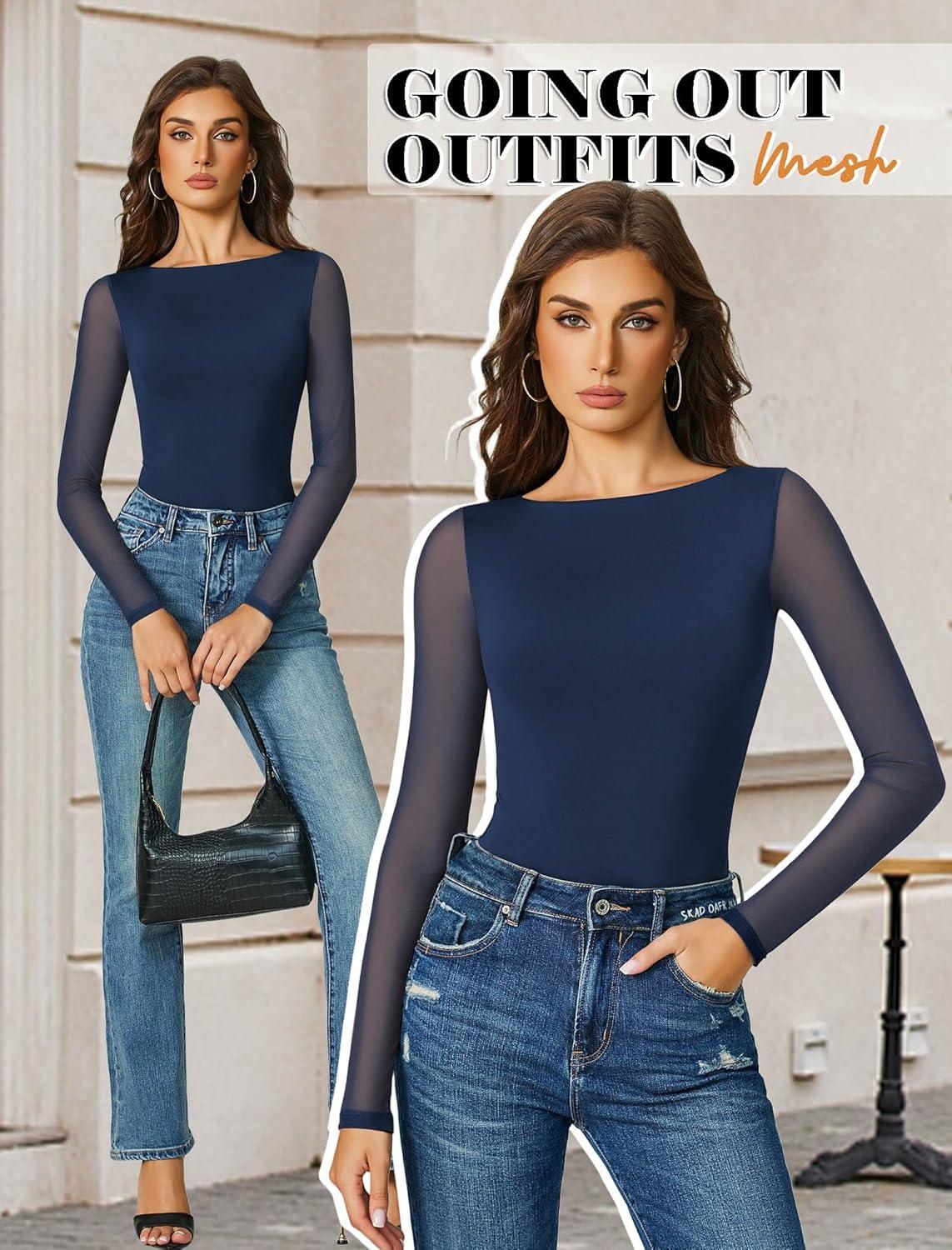 imageAvidlove Women Long Sleeve Body Suits Mesh Boat Neck Shapewear Bodysuit Crew Neck Leotards Going Out Tops Fall OutfitsNavy Blue