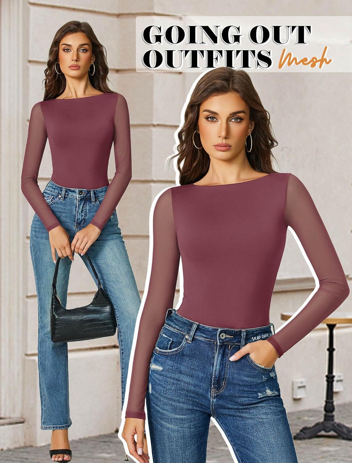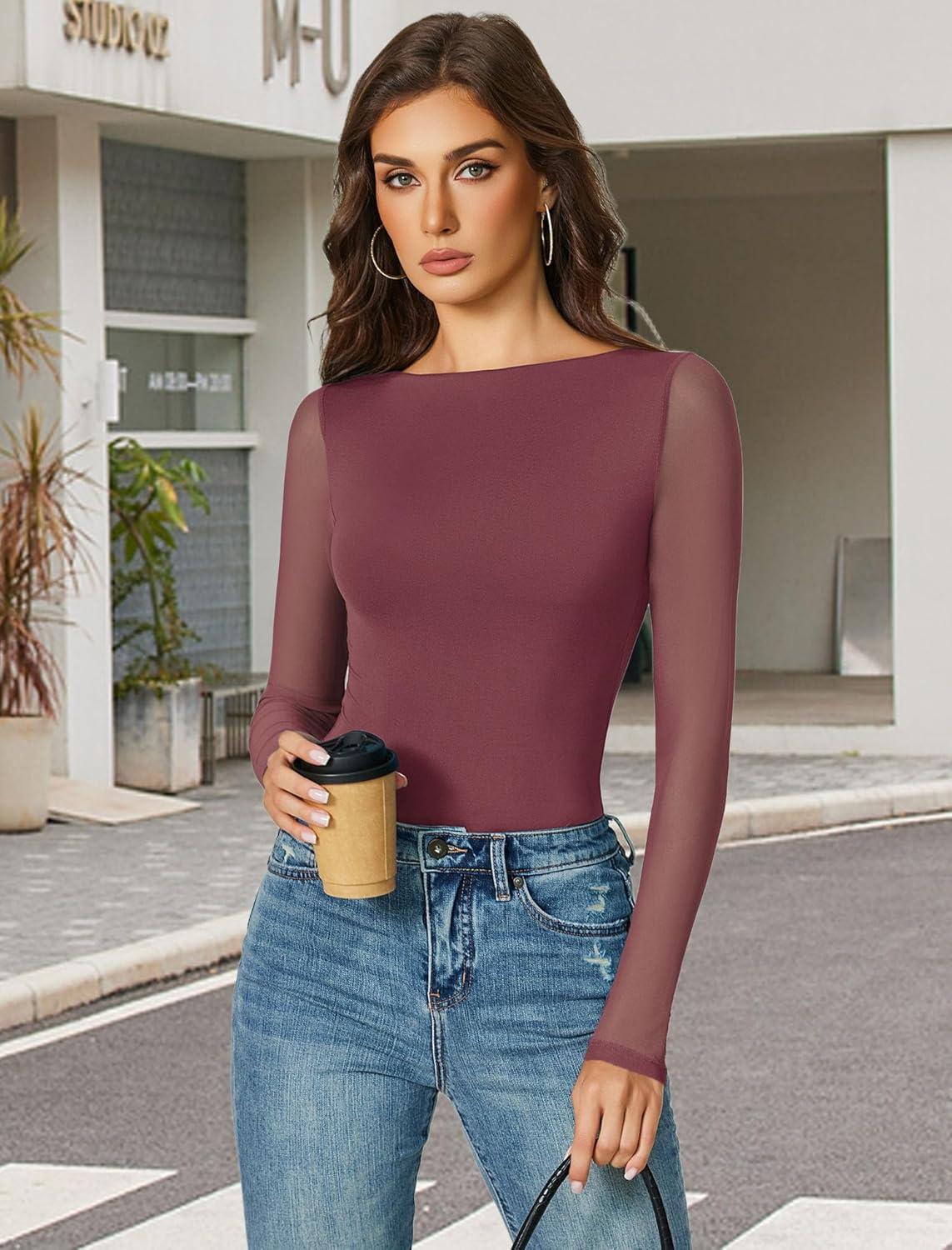 imageAvidlove Women Long Sleeve Body Suits Mesh Boat Neck Shapewear Bodysuit Crew Neck Leotards Going Out Tops Fall OutfitsPurple Red