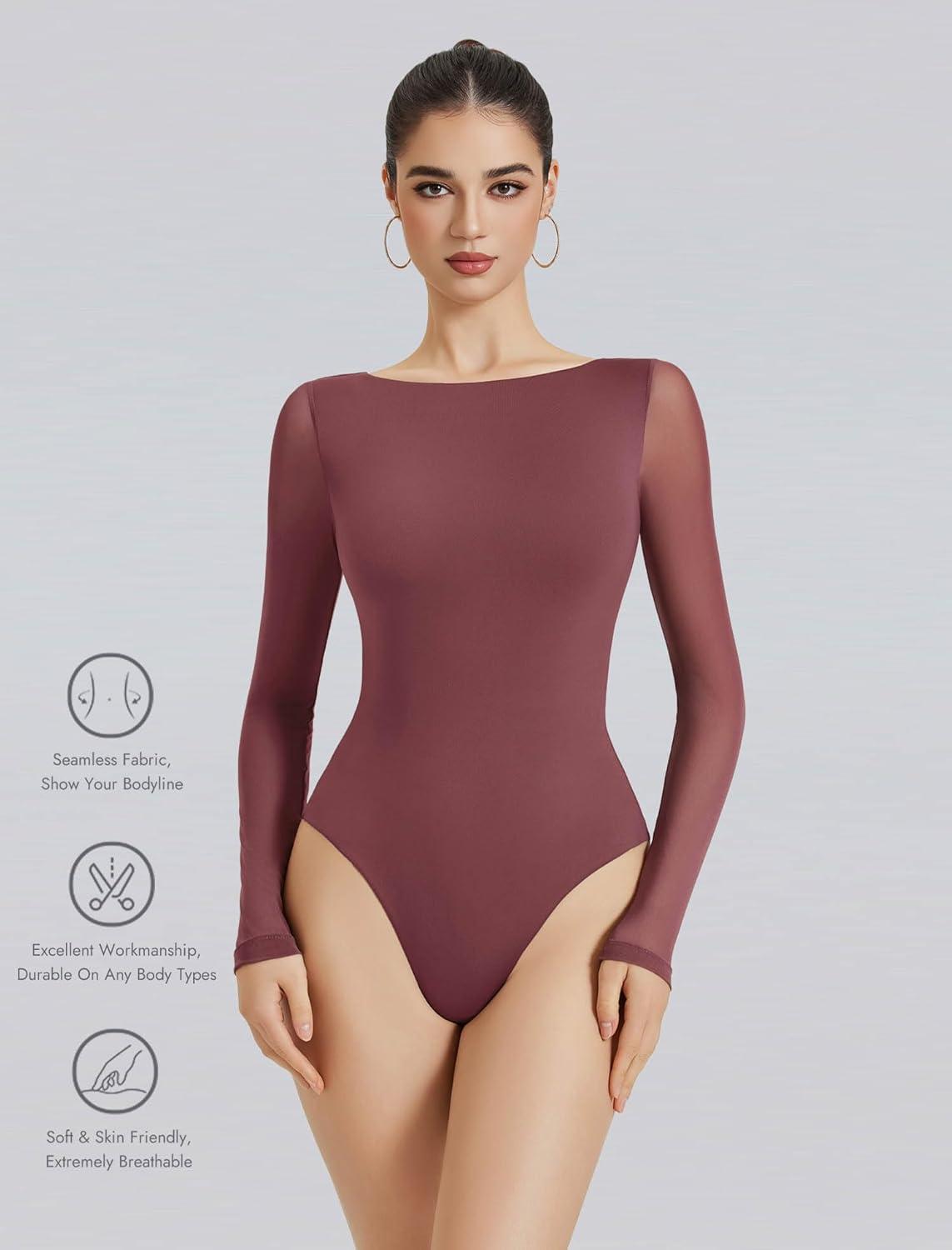 Avidlove Women Long Sleeve Body Suits Mesh Boat Neck Shapewear Bodysuit Crew Neck Leotards Going Out Tops Fall Outfits(Purple Red)