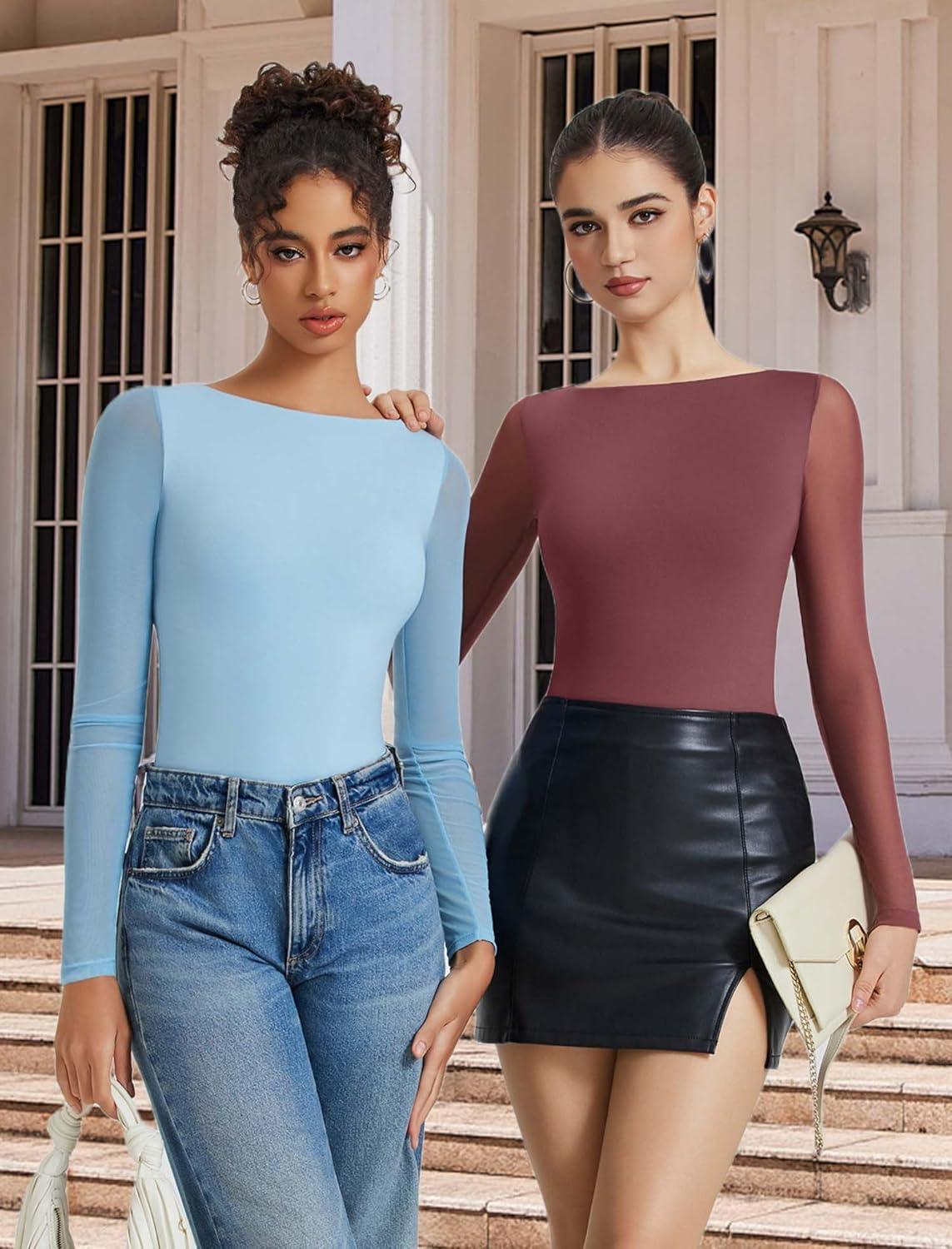 imageAvidlove Women Long Sleeve Body Suits Mesh Boat Neck Shapewear Bodysuit Crew Neck Leotards Going Out Tops Fall OutfitsRed