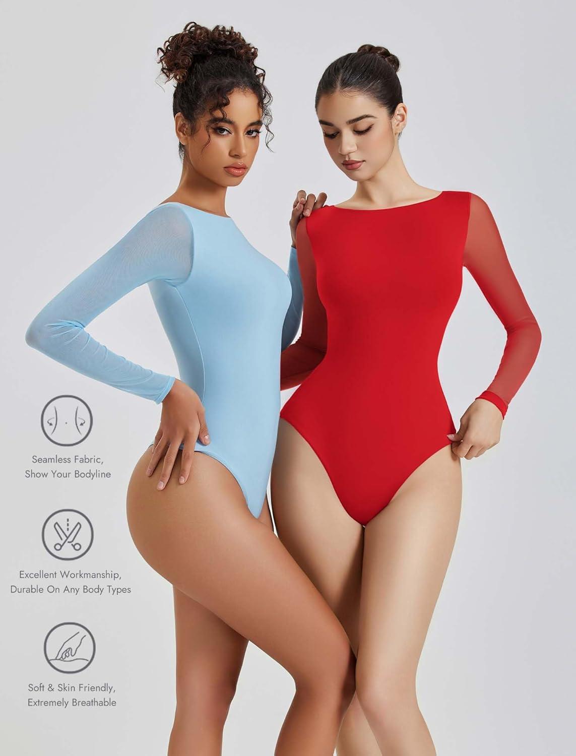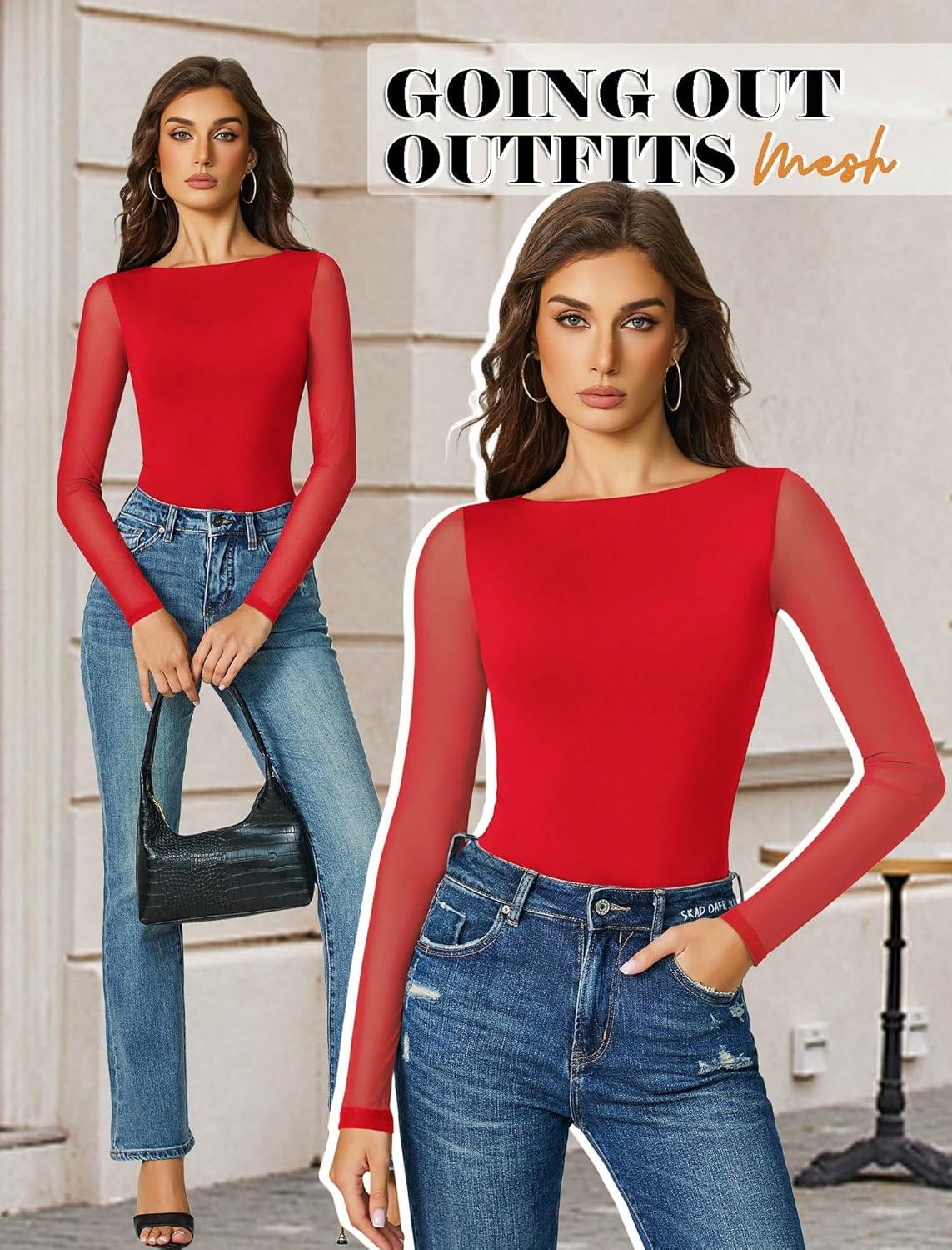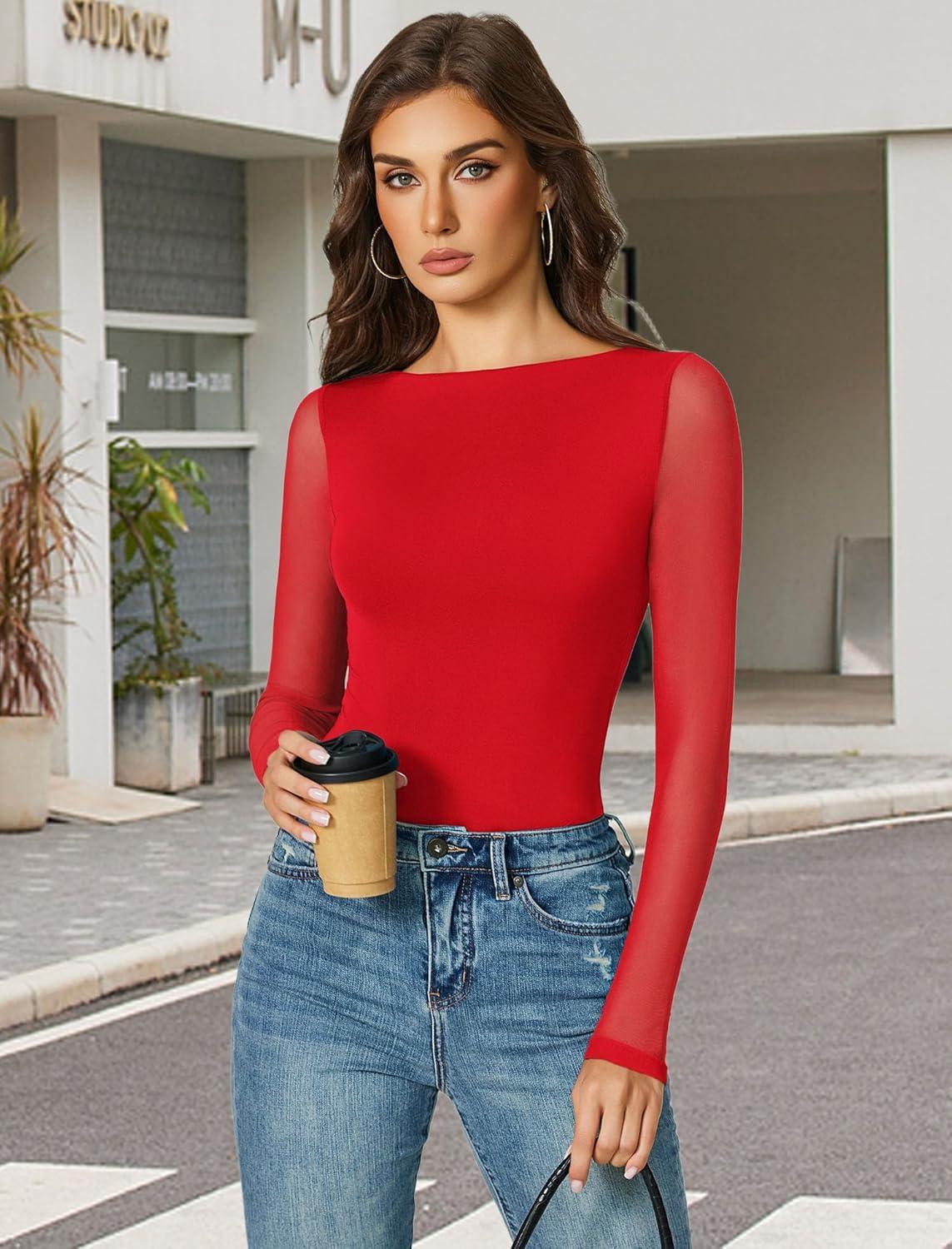 Avidlove Women Long Sleeve Body Suits Mesh Boat Neck Shapewear Bodysuit Crew Neck Leotards Going Out Tops Fall Outfits(Red)