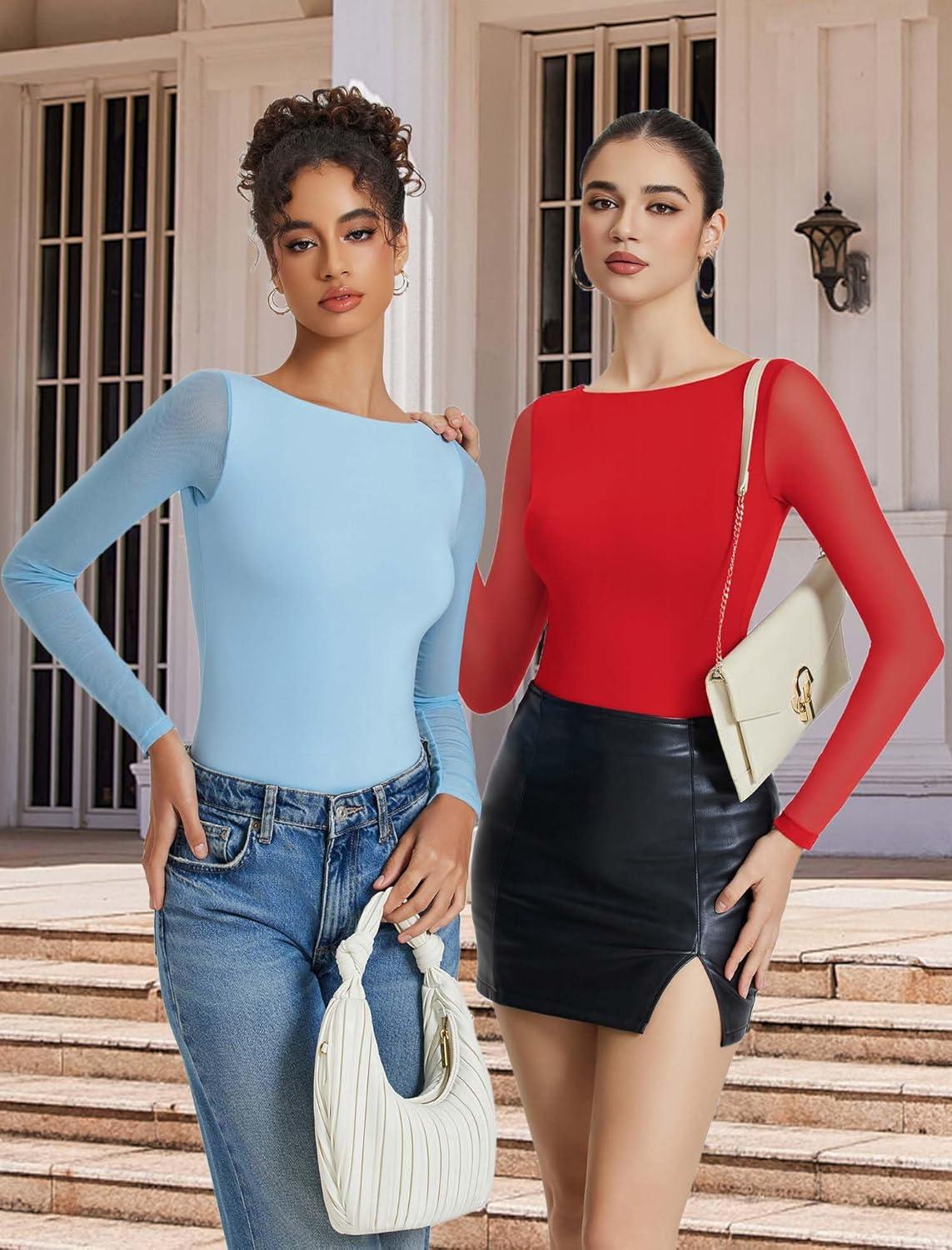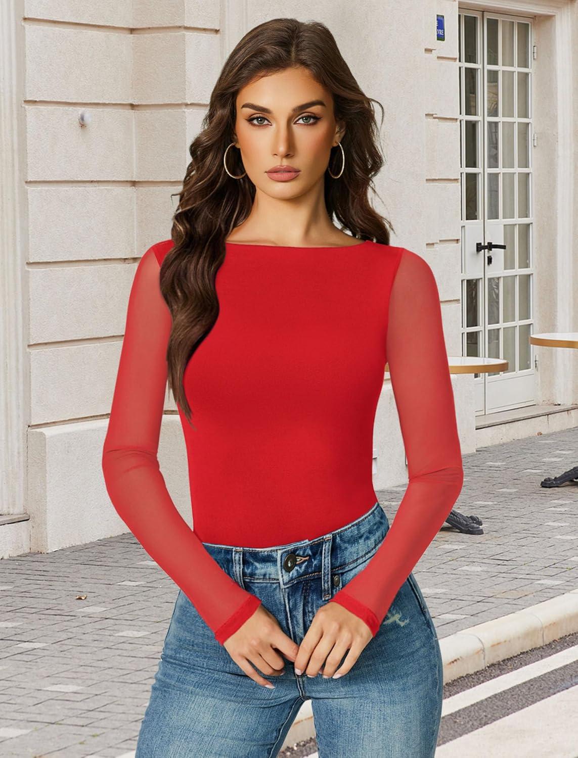 imageAvidlove Women Long Sleeve Body Suits Mesh Boat Neck Shapewear Bodysuit Crew Neck Leotards Going Out Tops Fall OutfitsRed