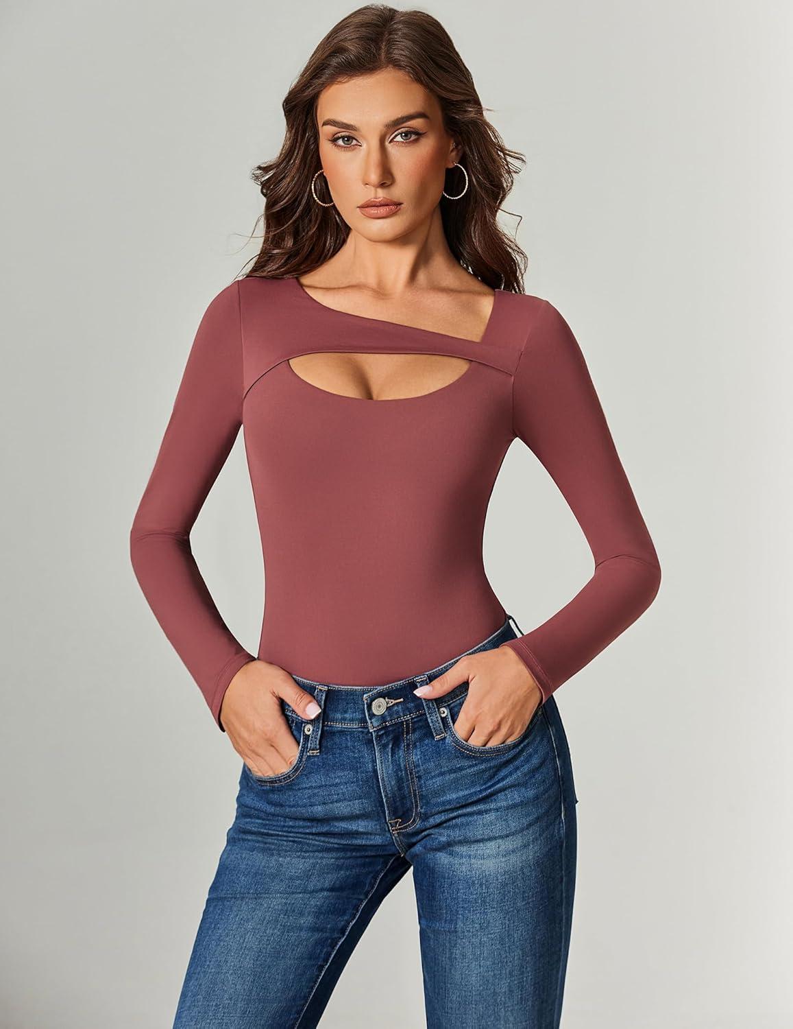 imageAvidlove Women Long Sleeve Bodysuit Scoop Neck Cutout Thong Body Suits Double Lined Slim Fitted Leotard Going Out TopsDark Purple Red
