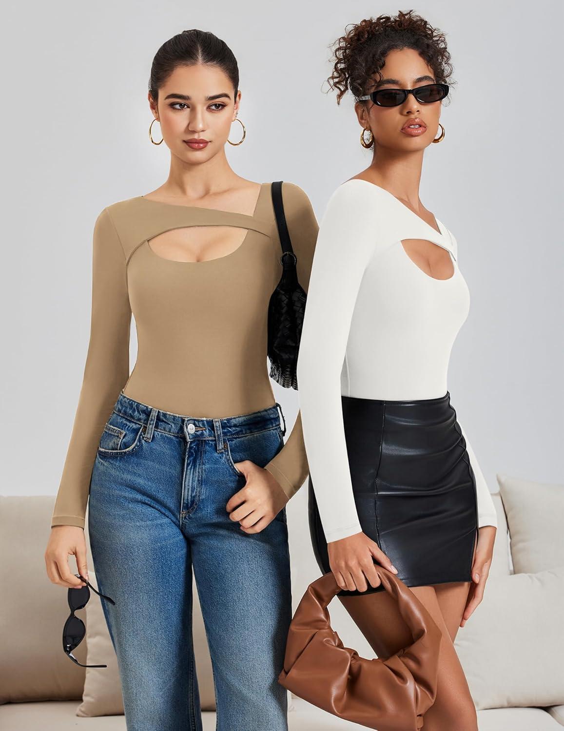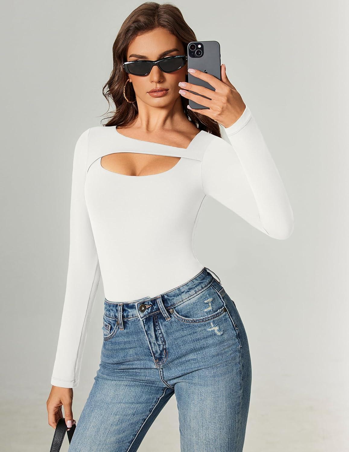 imageAvidlove Women Long Sleeve Bodysuit Scoop Neck Cutout Thong Body Suits Double Lined Slim Fitted Leotard Going Out TopsWhite