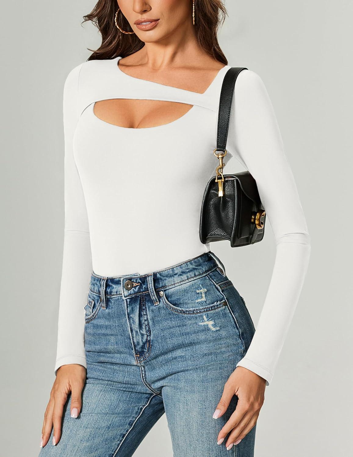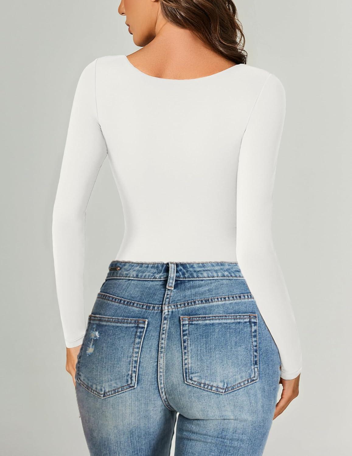 Avidlove Women Long Sleeve Bodysuit Scoop Neck Cutout Thong Body Suits Double Lined Slim Fitted Leotard Going Out Tops(White)