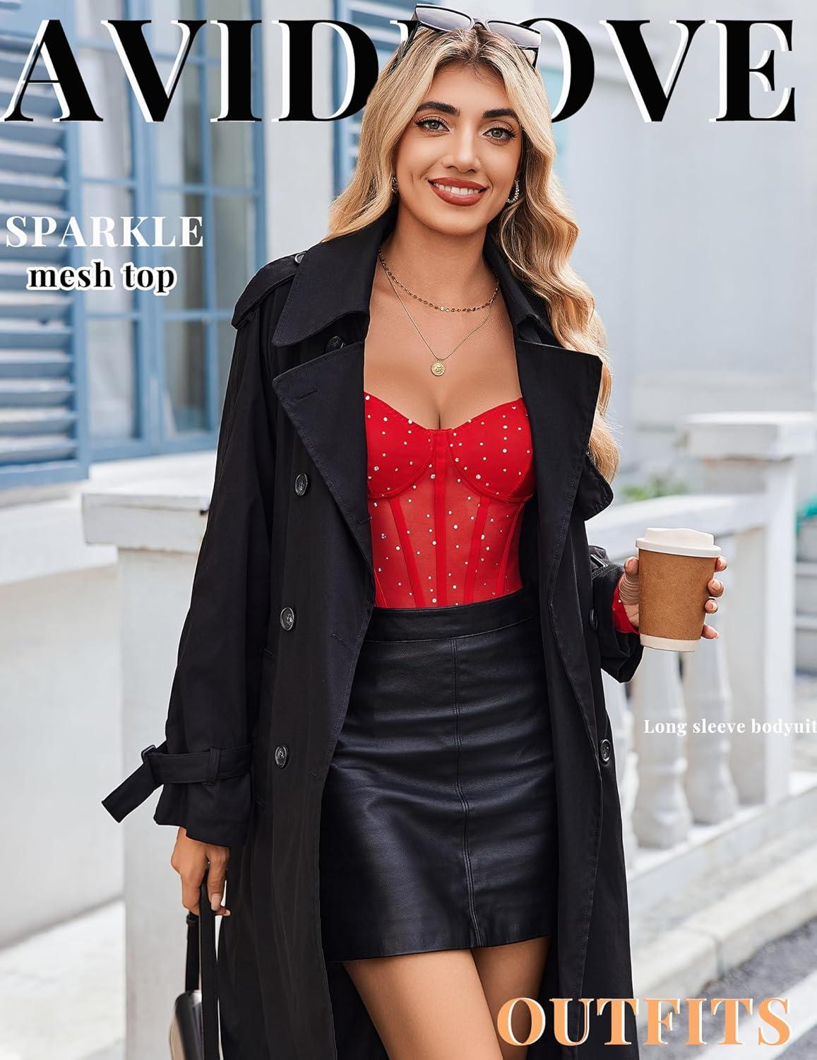 Avidlove Women Long Sleeve Bodysuit Sparkle Body Suits Top Mesh One Piece Leotard Shirt Going Out Tops Fall Outfits S-XXL(Red)