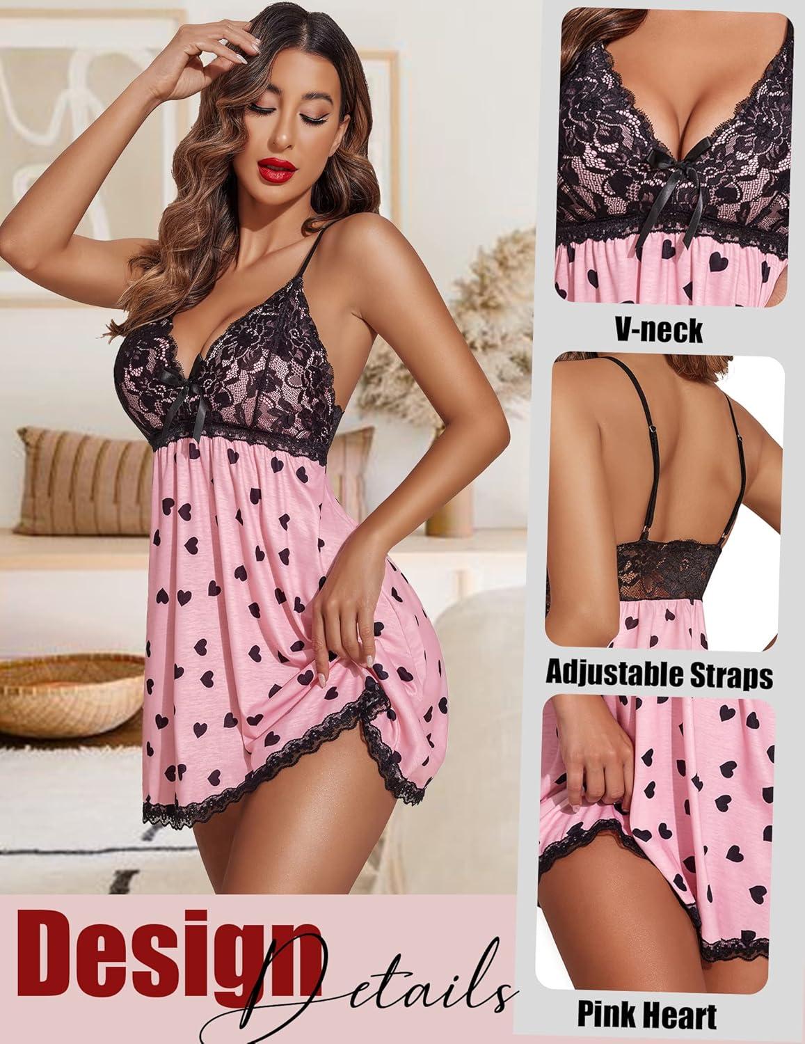 Avidlove Women Nightgown Sexy Sleepwear Lace Chemise V-neck Modal Babydoll Lounge Dress(Black Heart)