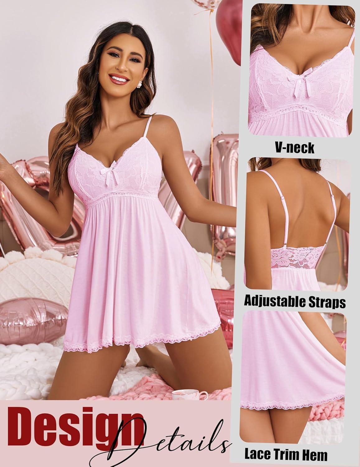 Avidlove Women Nightgown Sexy Sleepwear Lace Chemise V-neck Modal Babydoll Lounge Dress(Light Pink)