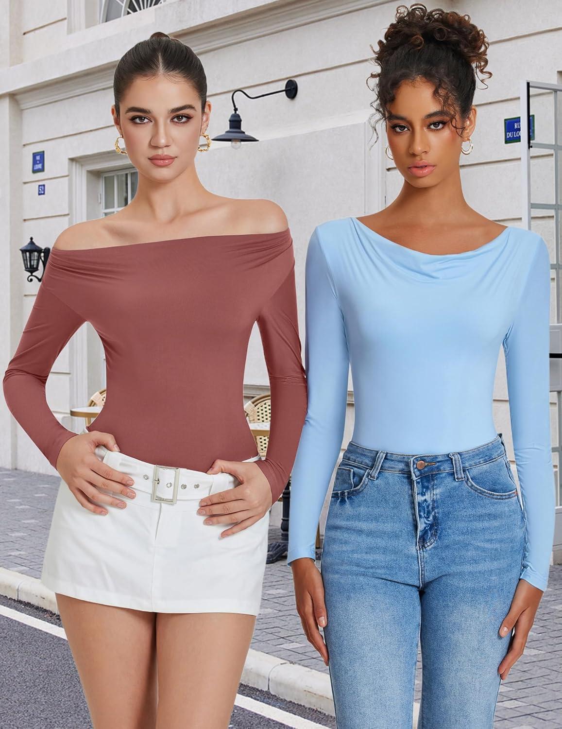 imageAvidlove Women Off the Shoulder Long Sleeve Bodysuit Double Lined Thong Body Suits Tops Soft Sexy OutfitsBrown