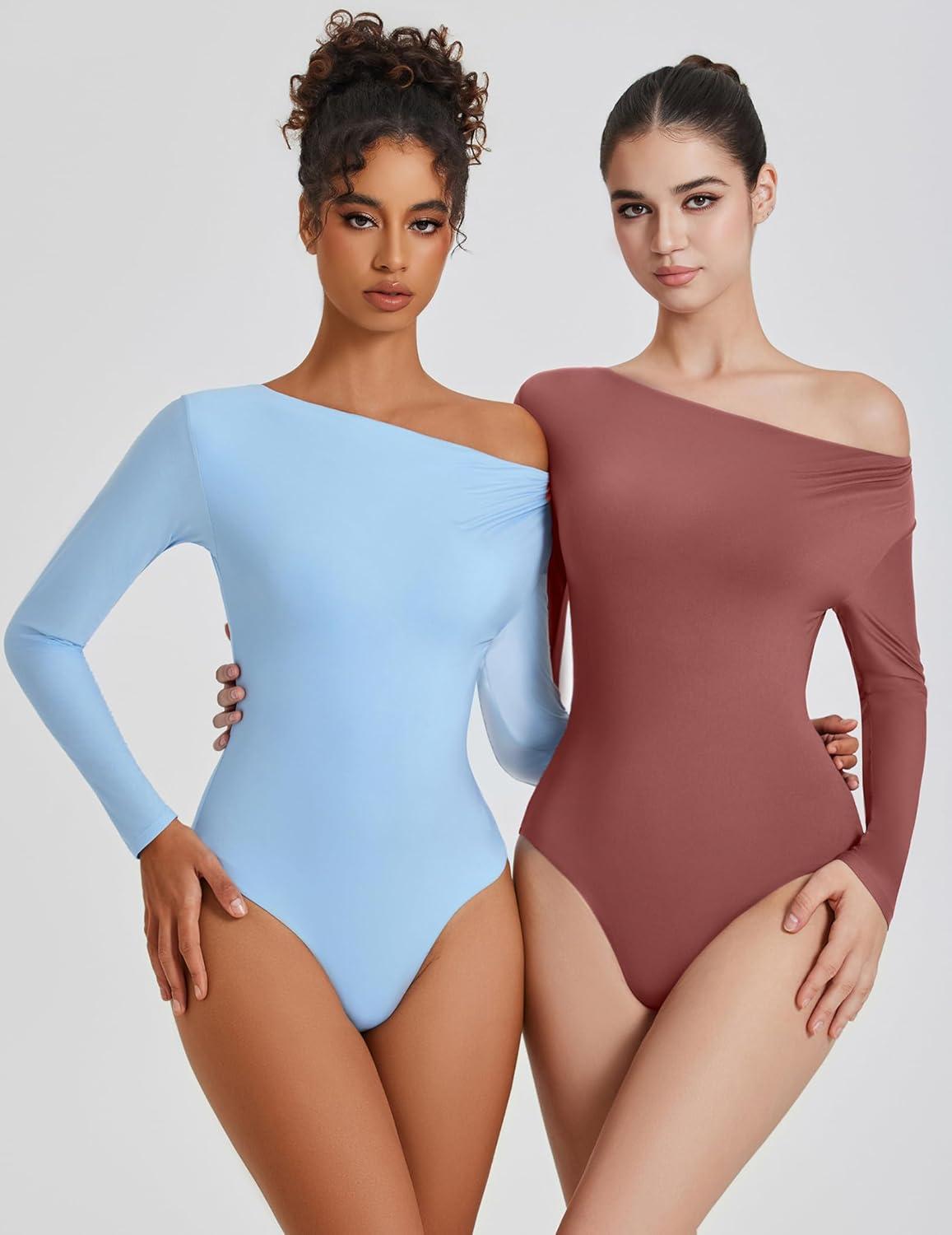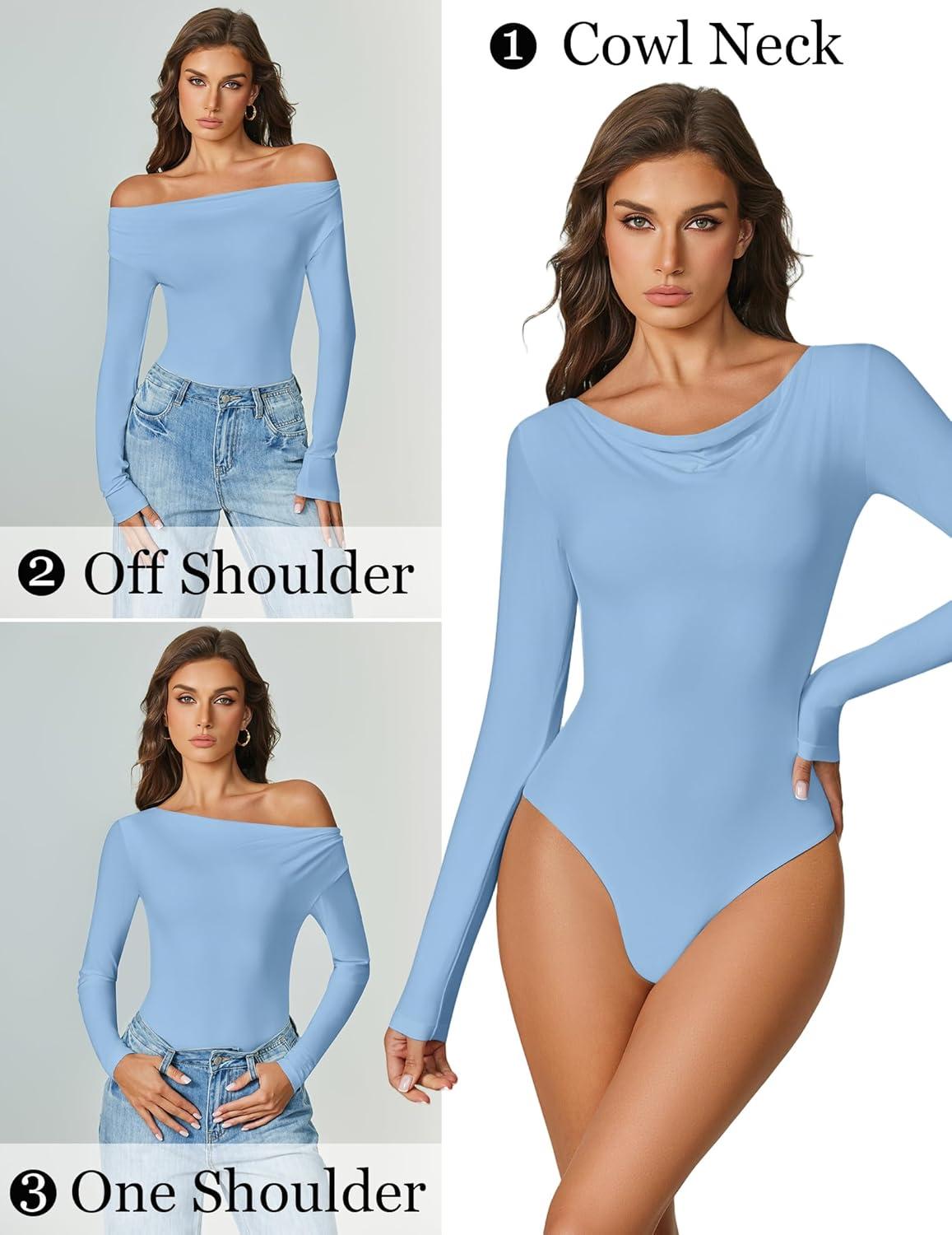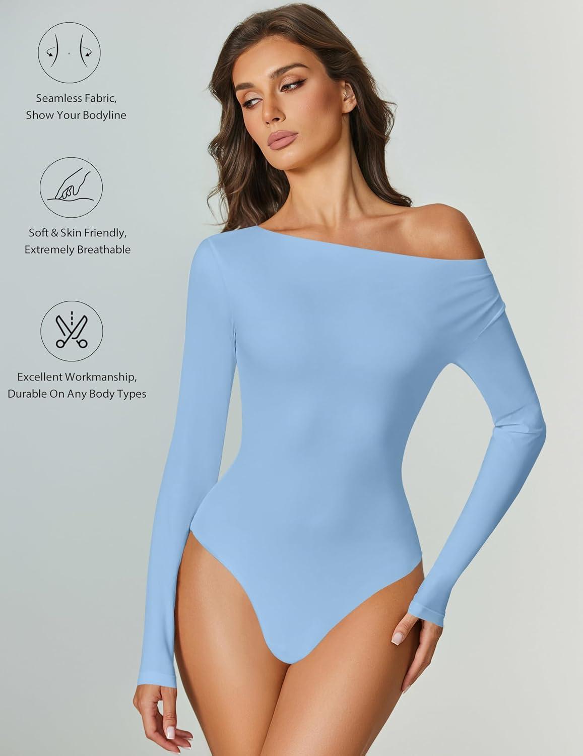 imageAvidlove Women Off the Shoulder Long Sleeve Bodysuit Double Lined Thong Body Suits Tops Soft Sexy OutfitsLight Blue