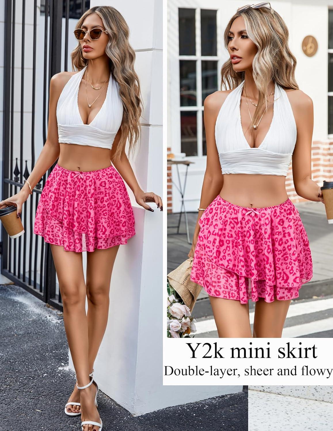 Avidlove Women Pleated Sheer Mini Skirt Y2k Asymmetrical Flowy Short Skirts Sexy Rave Outfits(Leopard Print Pink)