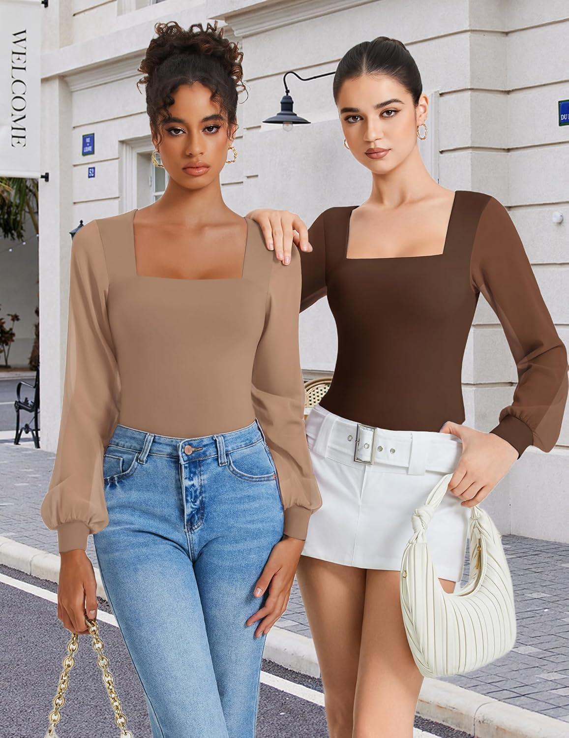 Avidlove Women Puff Long Sleeve Bodysuit Mesh Square Neck Thong Sexy Body Suits Double Lined Leotards(Brown)