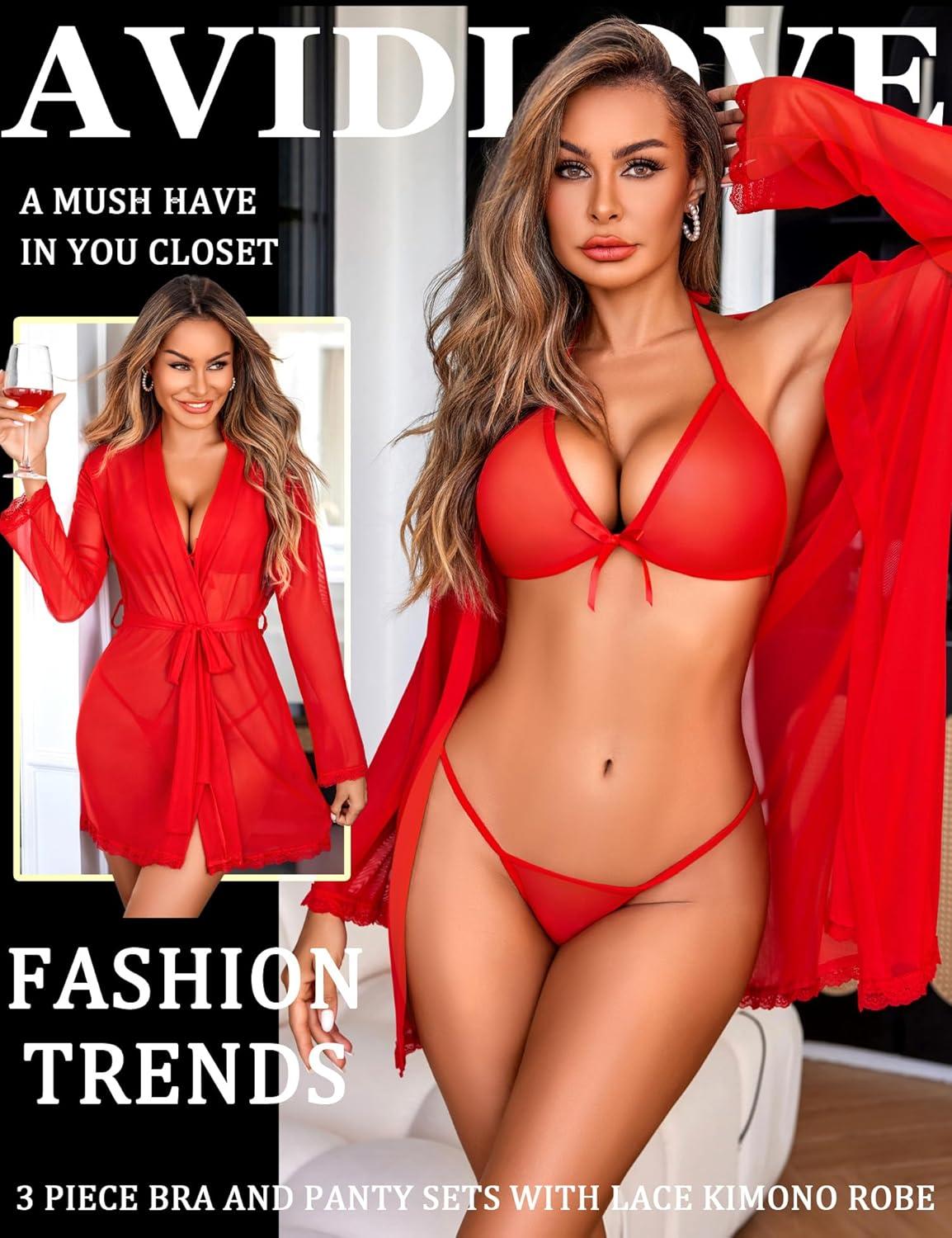 Avidlove Women Sexy Lingerie Set 3 Piece Mesh Kimono Robe with Bra and Panty Sheer Sleepwear(Red)