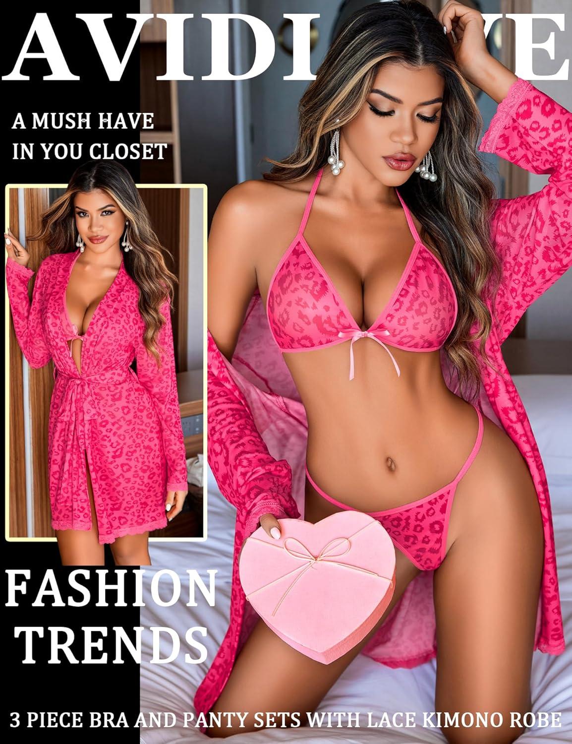 Avidlove Women Sexy Lingerie Set 3 Piece Mesh Kimono Robe with Bra and Panty Sheer Sleepwear(Pink Leopard)