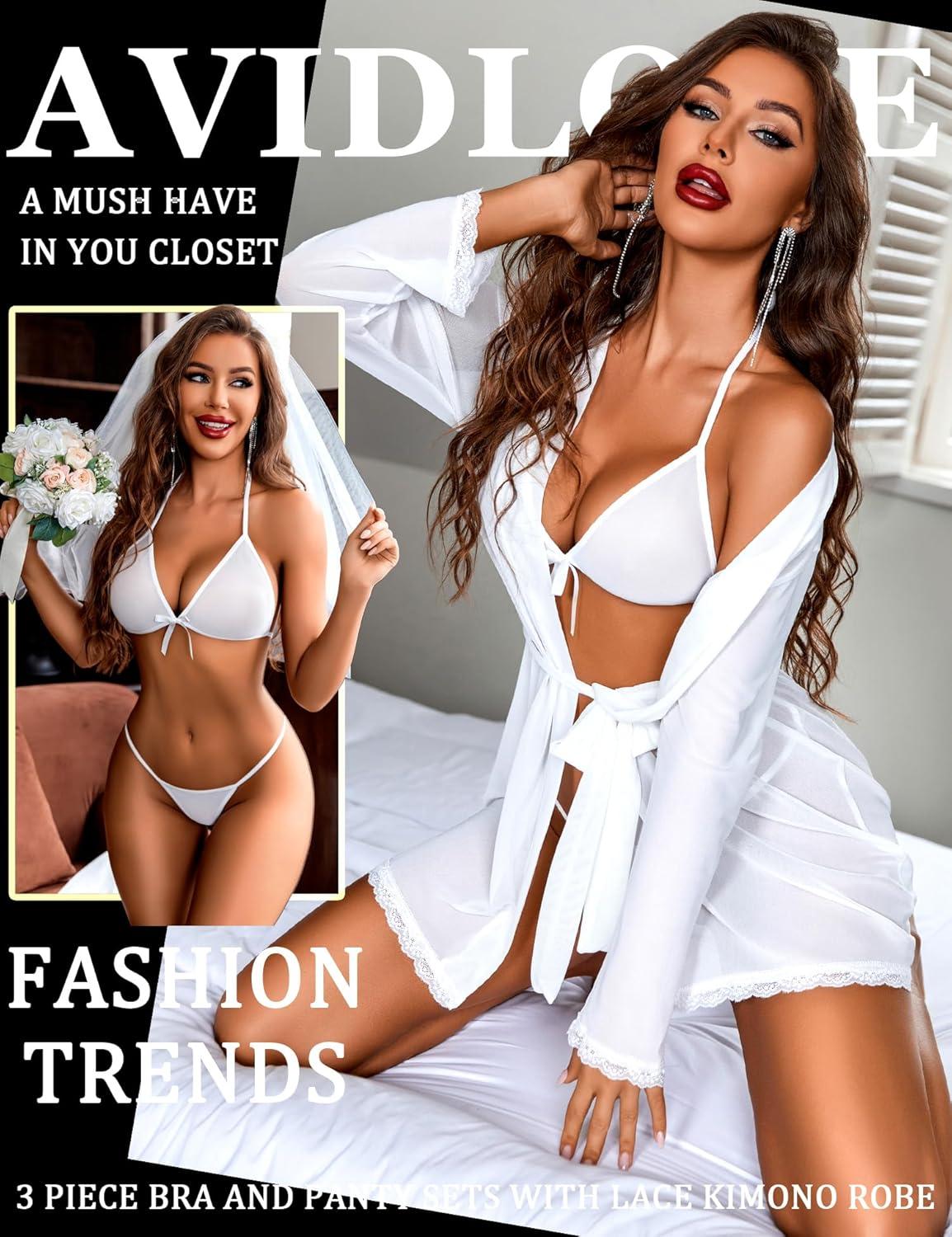 Avidlove Women Sexy Lingerie Set 3 Piece Mesh Kimono Robe with Bra and Panty Sheer Sleepwear(White)