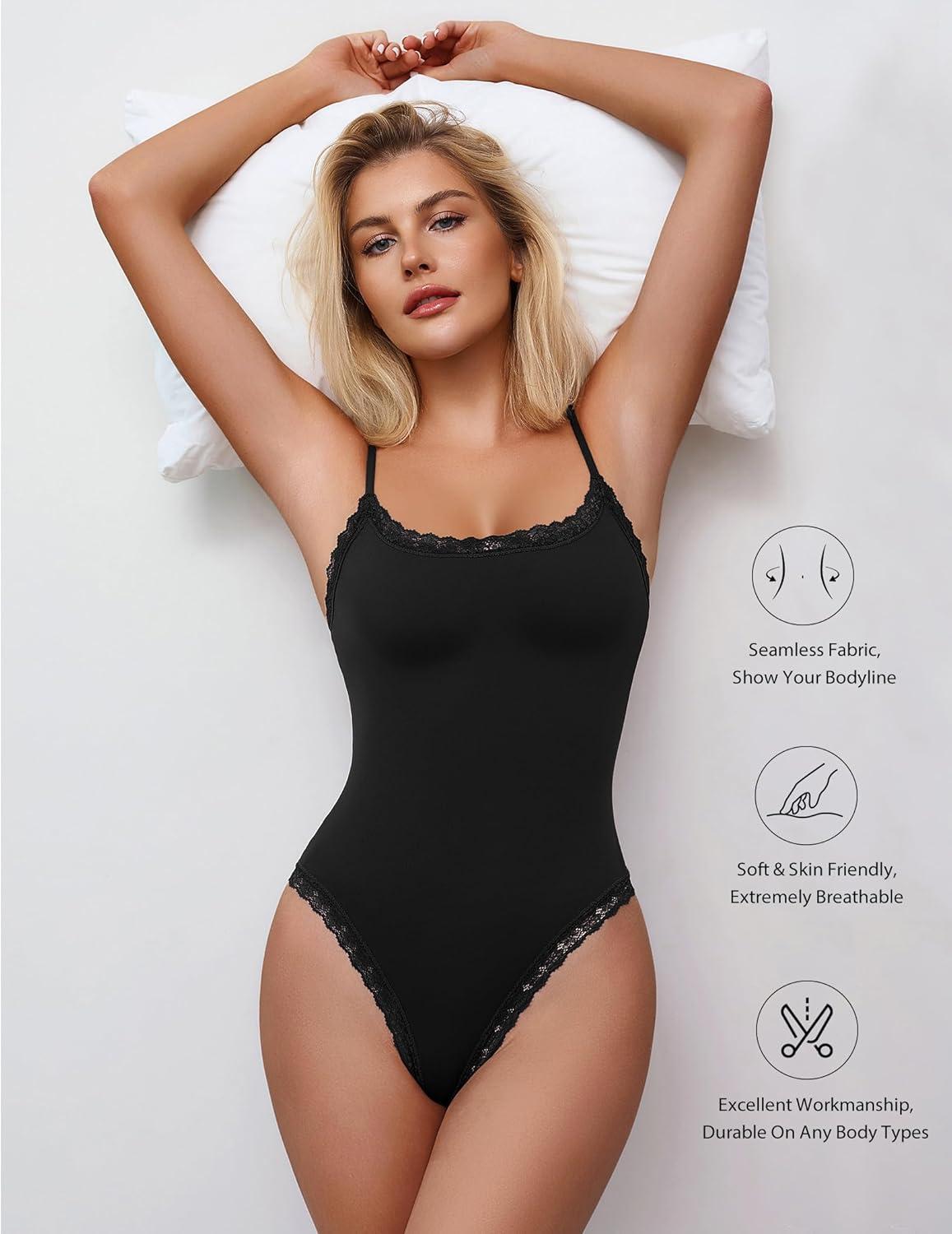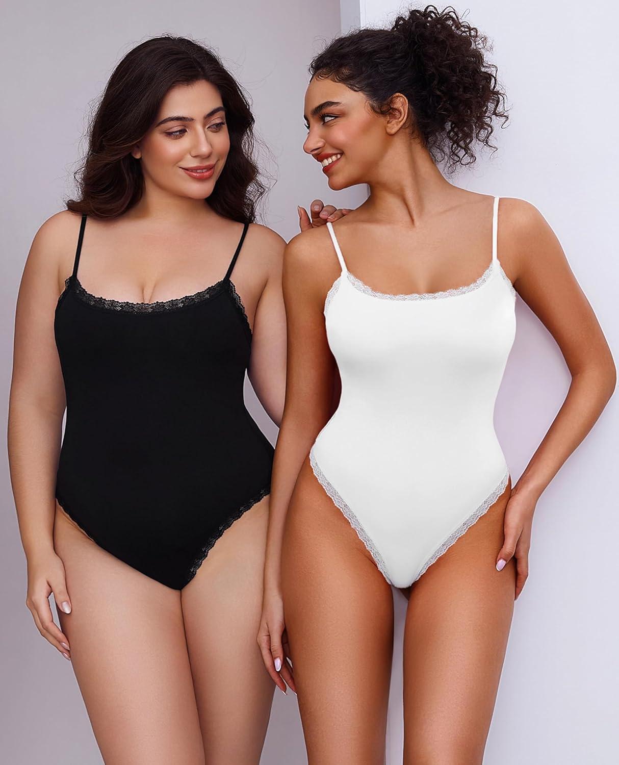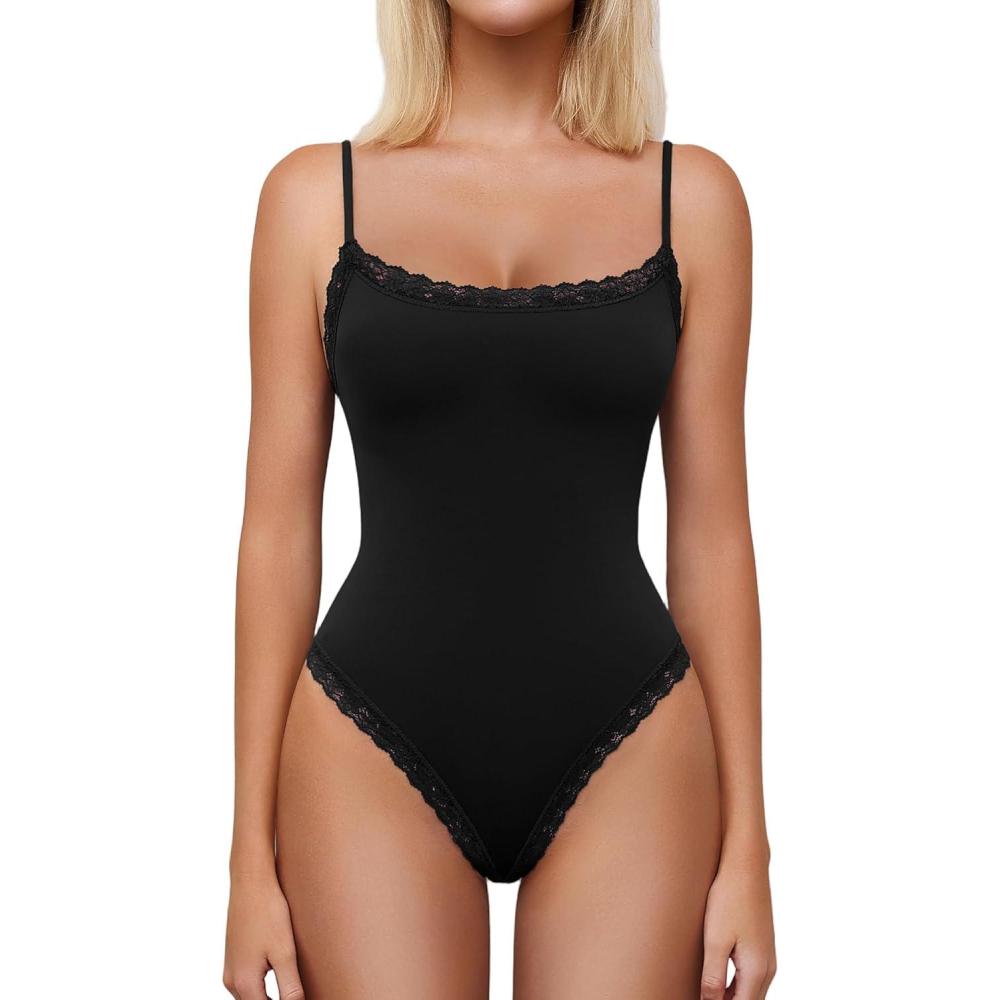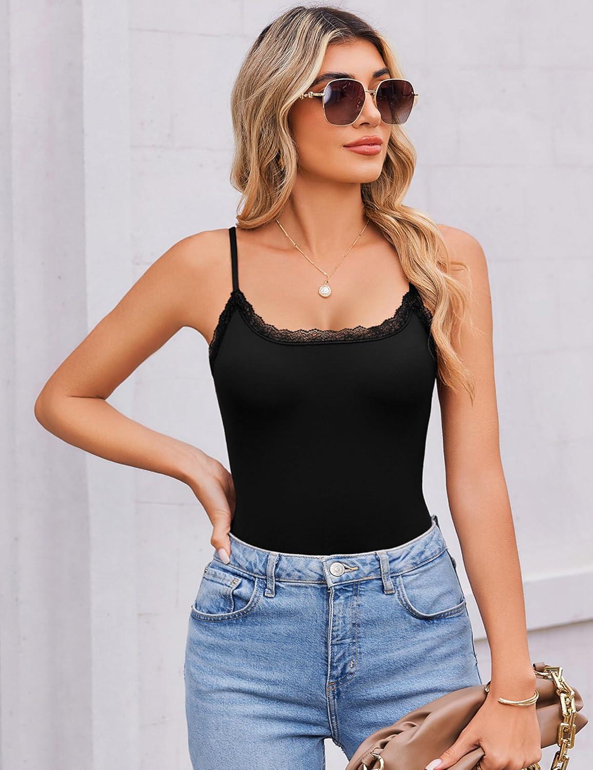 imageAvidlove Women Square Neck Lace Bodysuit Sleeveless Spaghetti Strap Tank Top Body SuitsBlack