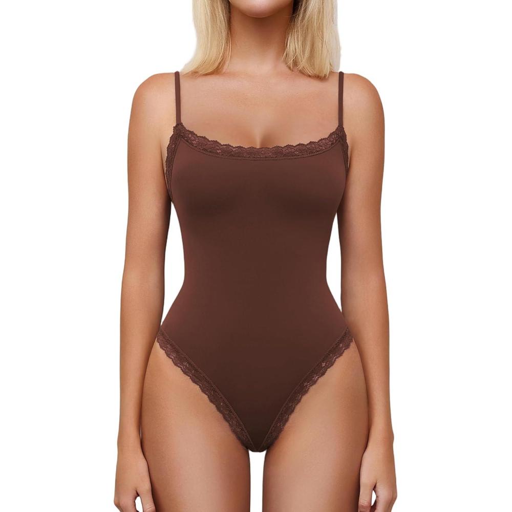 imageAvidlove Women Square Neck Lace Bodysuit Sleeveless Spaghetti Strap Tank Top Body SuitsBrown
