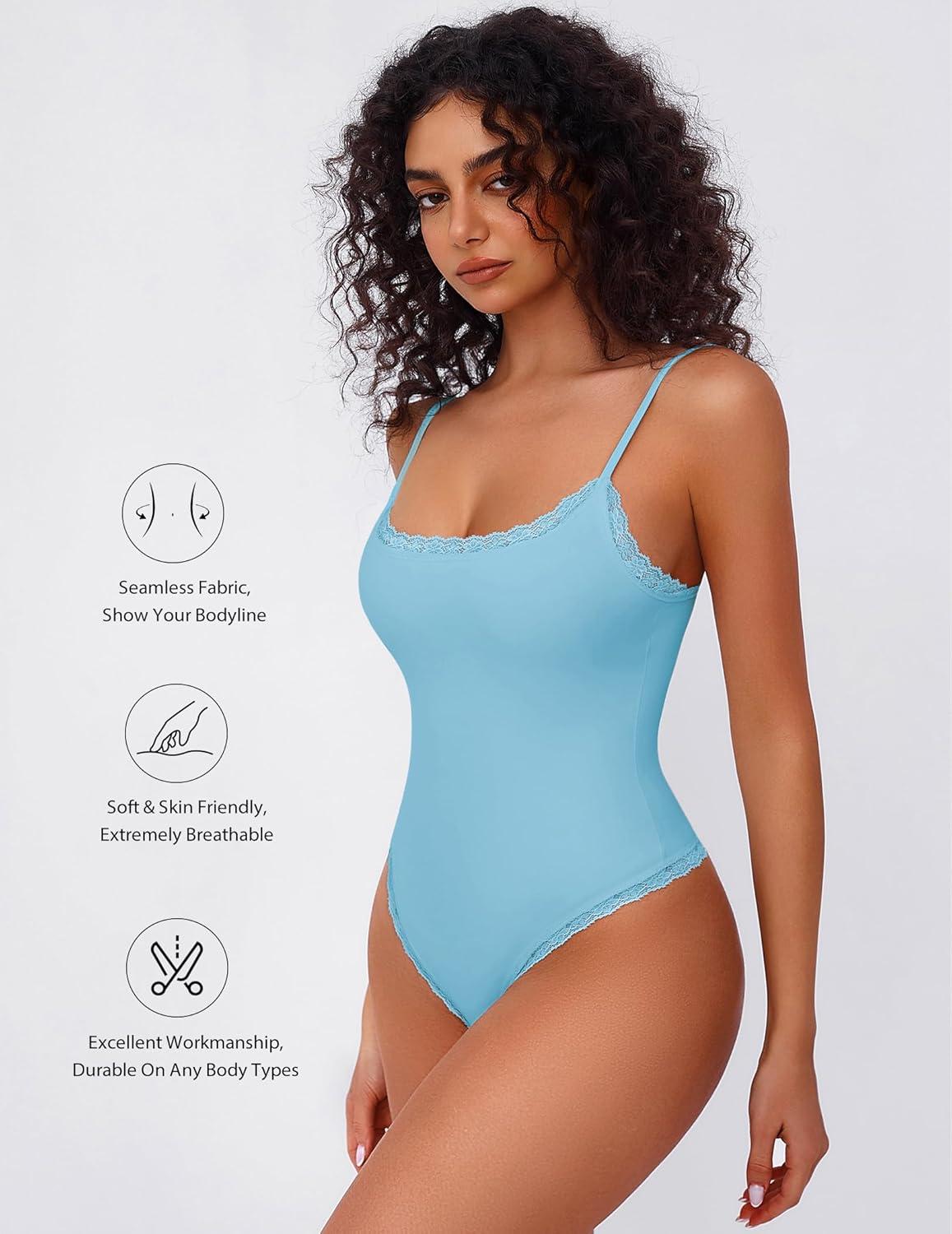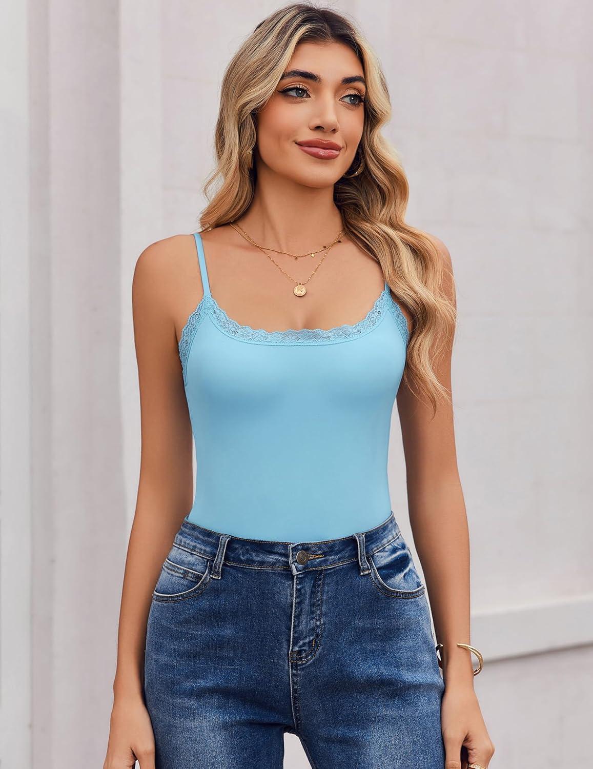 imageAvidlove Women Square Neck Lace Bodysuit Sleeveless Spaghetti Strap Tank Top Body SuitsLight Blue