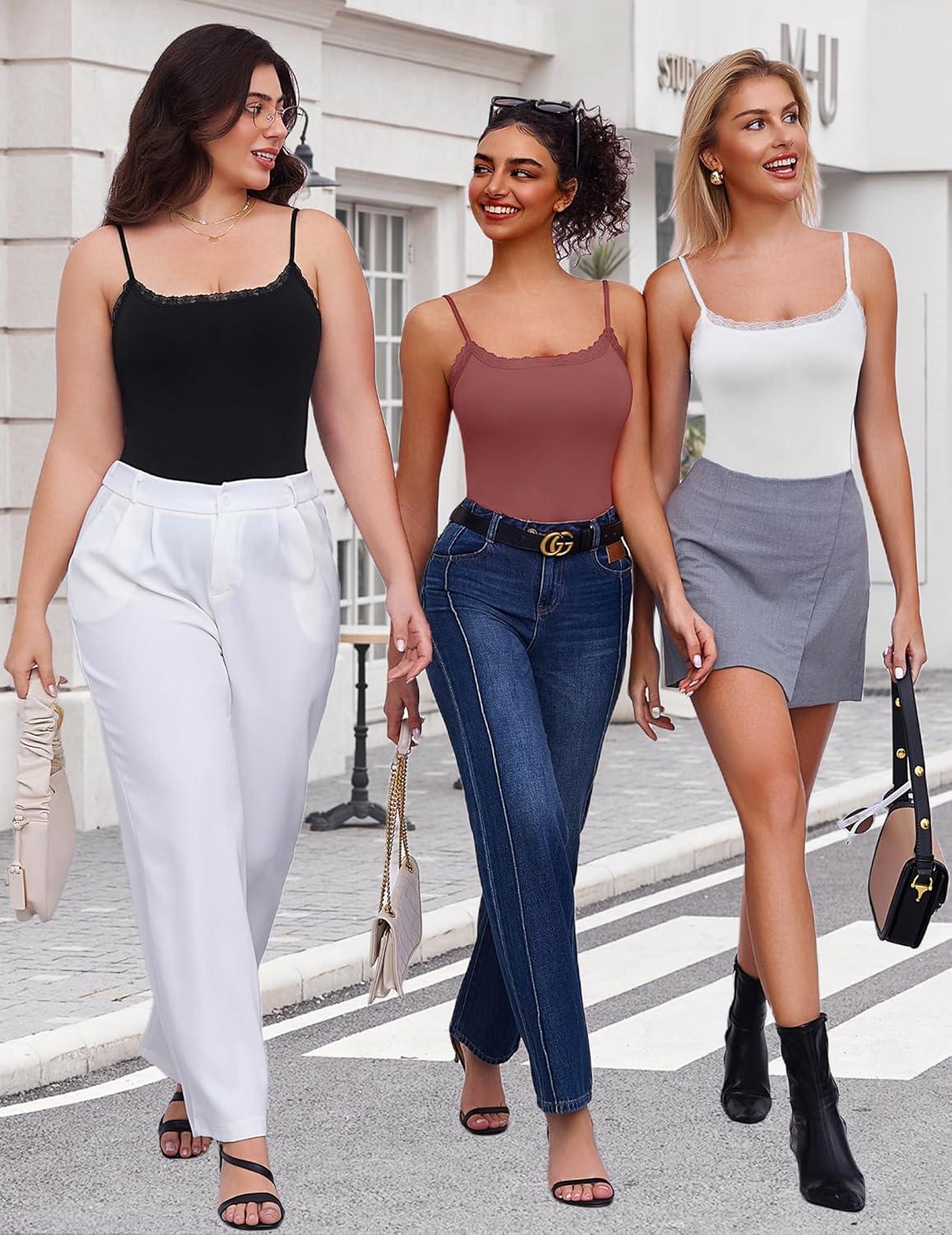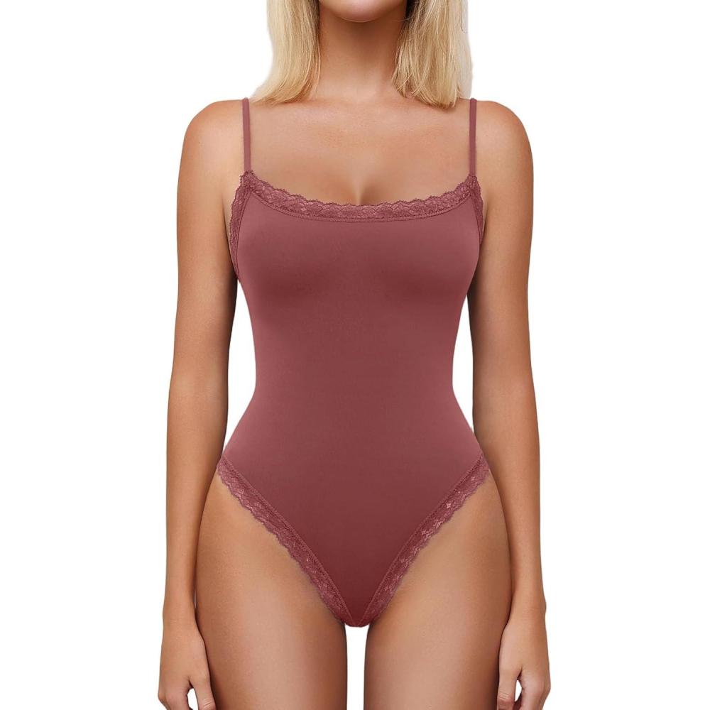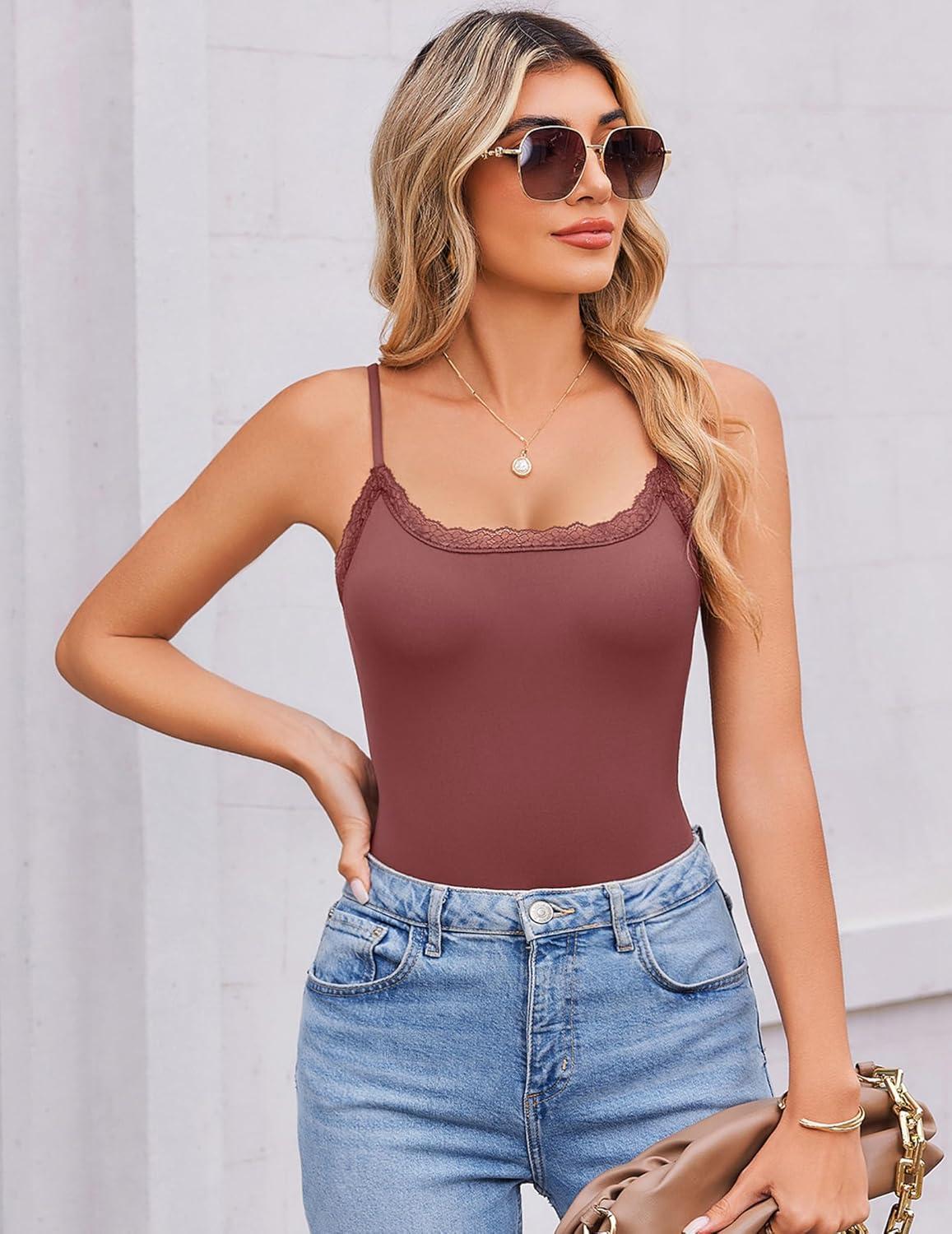 imageAvidlove Women Square Neck Lace Bodysuit Sleeveless Spaghetti Strap Tank Top Body SuitsRed